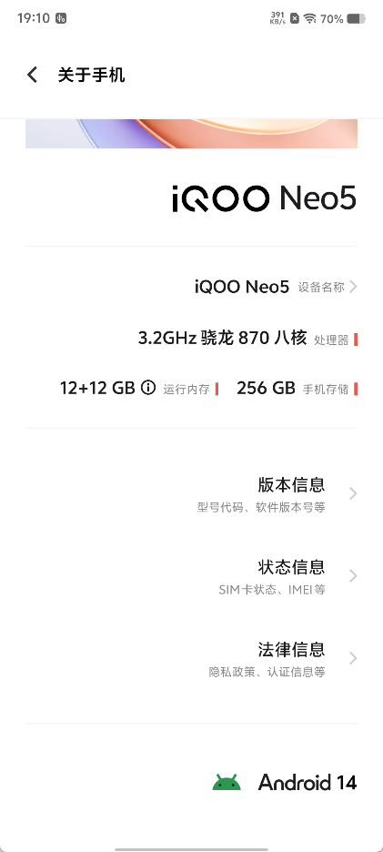 示例(本文演示设备):IQOO Neo5,Android 14,12GB RAM / 256GB 存储