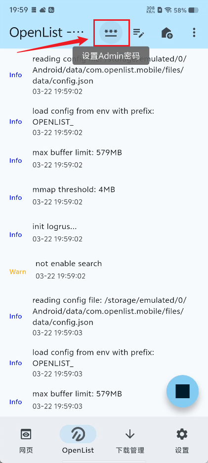 首先,打开OpenList应用,默认显示为OpenList的Tab页面,我们点击顶部的【三个*号】进行设置admin的密码: