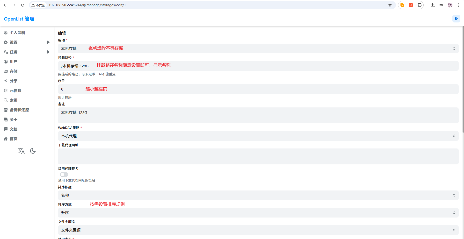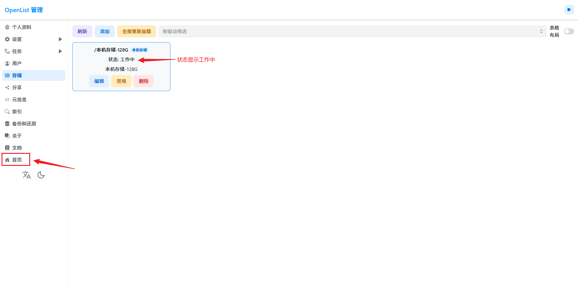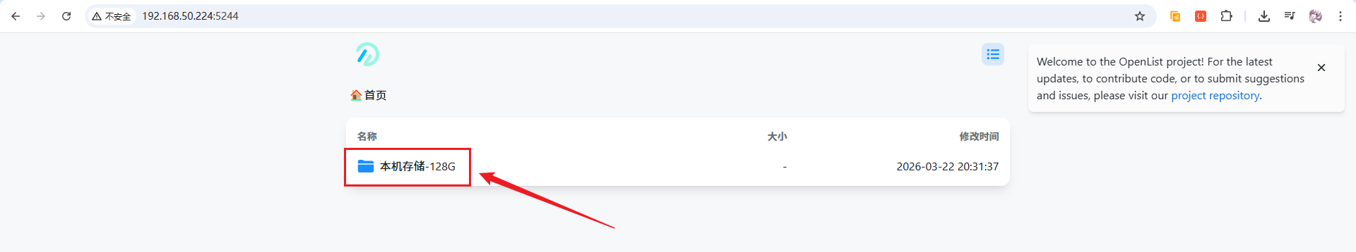 这样,OpenList就大功告成了,接下来我们把它内置的128G存储给挂载上!