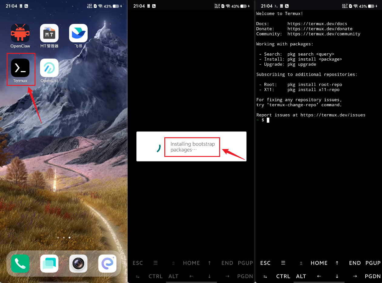 首先,打开安装好的Termux软件,首次打开会进行一些软件包的安装,等待片刻即可: