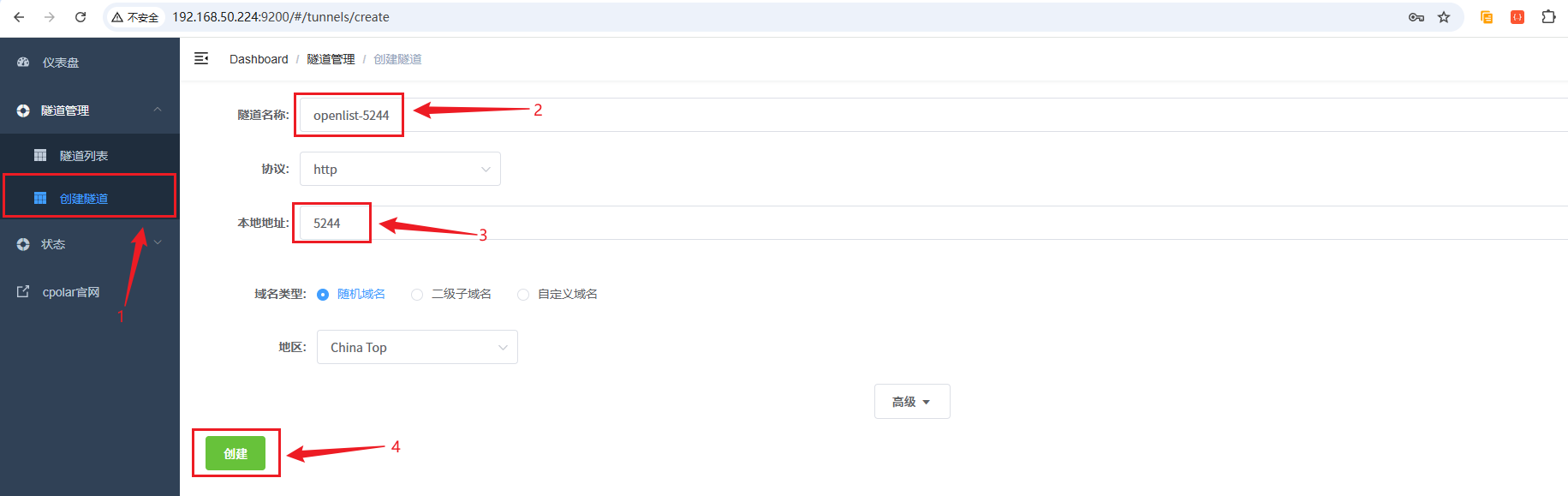 点击【创建隧道】菜单,填写一个【隧道名称】,然后本地地址填写【5244】,然后点击创建按钮: