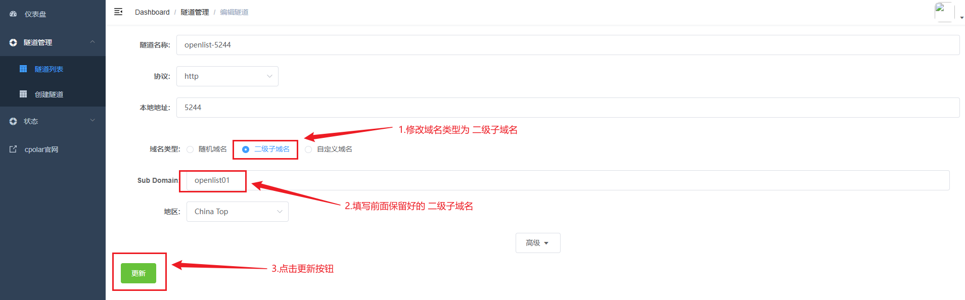 接着来到【状态】菜单下的【在线隧道列表】可以看到隧道名称为【openlist-5244】的公网地址已经变更为【二级子域名+固定域名主体及后缀】的形式了: