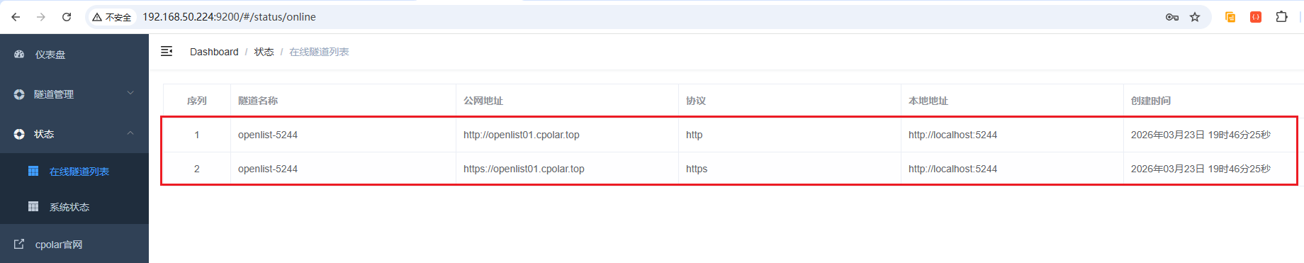 提示创建成功后,接着来到侧边栏的【状态>在线隧道列表】,可以看到名称为【openlist-5244】隧道的两条记录信息,一条协议为http,另一条协议为https: