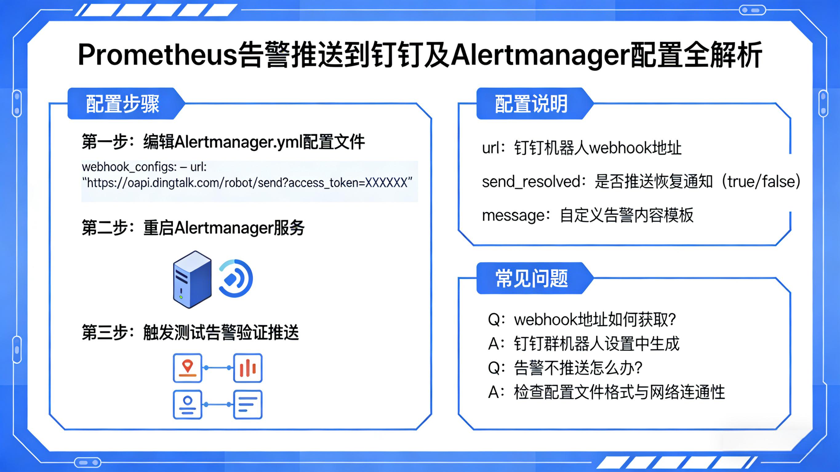 为此,社区涌现出如prometheus-webhook-dingtalk等成熟中间件,为打通Prometheus与钉钉之间“最后一公里”提供了优雅解法。本文将手把手带你从零开始,完整配置Alertmanager向钉钉推送告警,涵盖钉钉机器人创建、中间服务部署、Alertmanager路由策略设计、消息模板优化等关键环节。