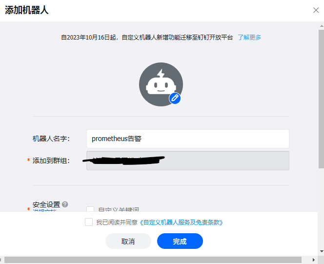 给机器人起个名字,我这里是“prometheus告警”: