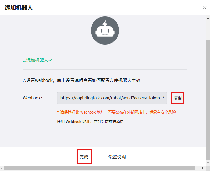 点击完成后,复制生成的Webhook,留着备用: