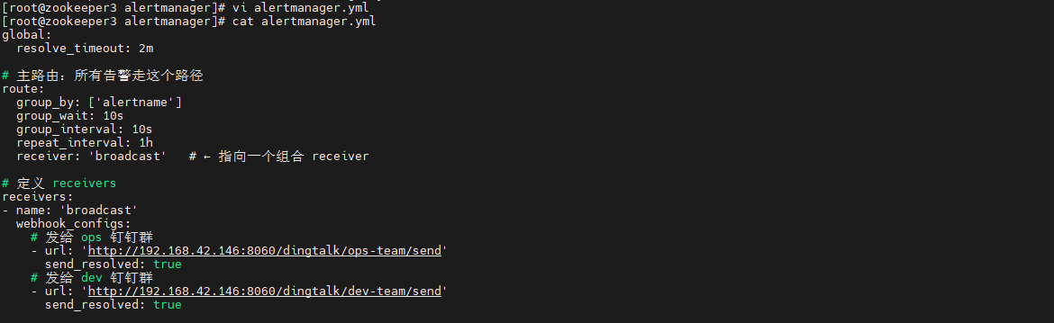 配置Alertmanager配置文件,配置到告警自动发送到钉钉: