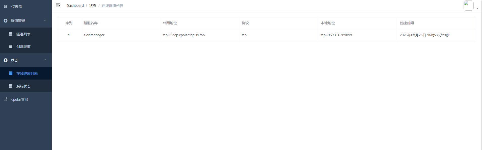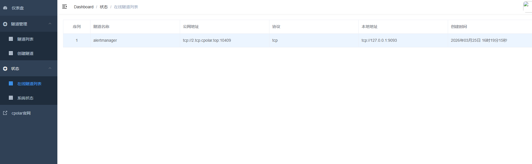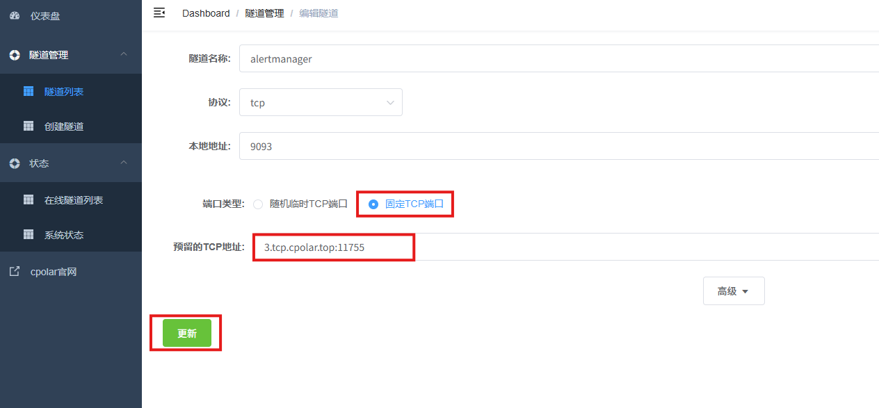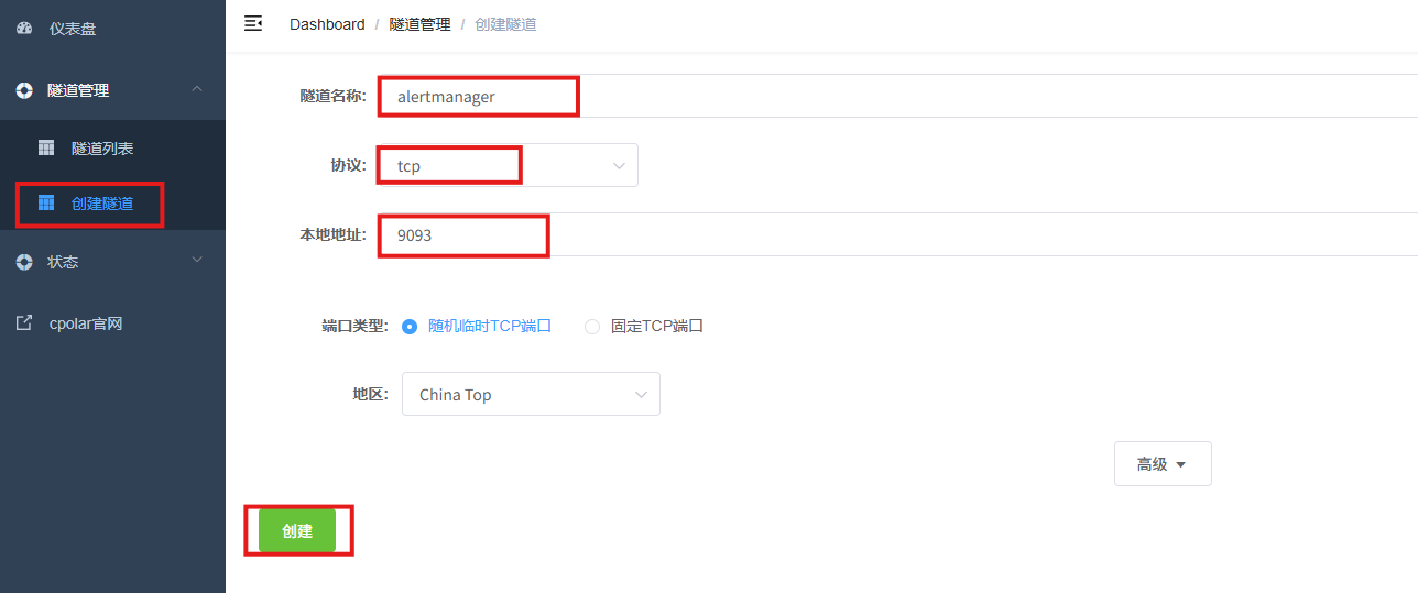 - 隧道名称:可自定义,本例使用了:alertmanager,注意不要与已有的隧道名称重复