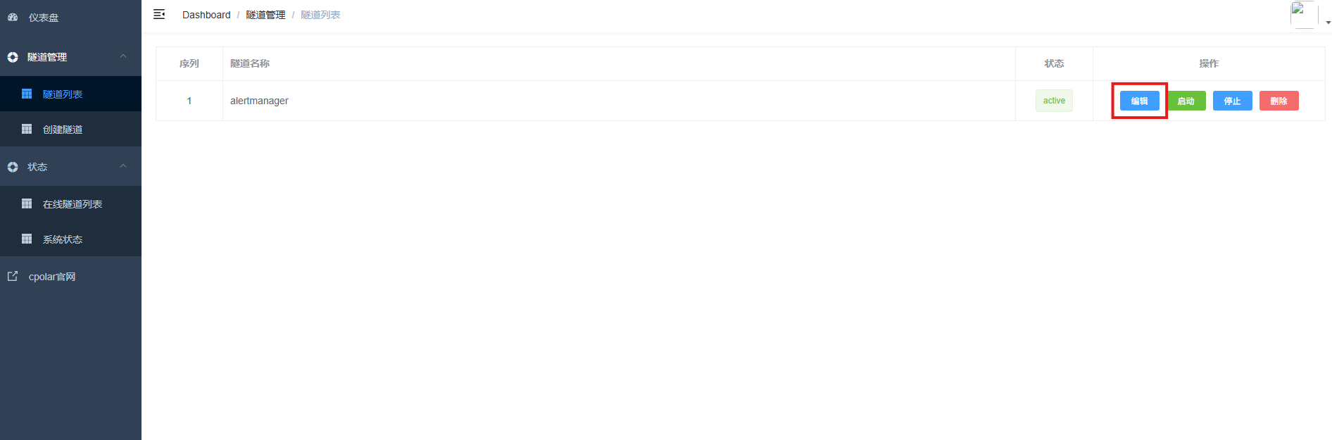 登录cpolar web UI管理界面,点击左侧仪表盘的隧道管理——隧道列表,找到所要配置的隧道ssh,点击右侧的编辑。