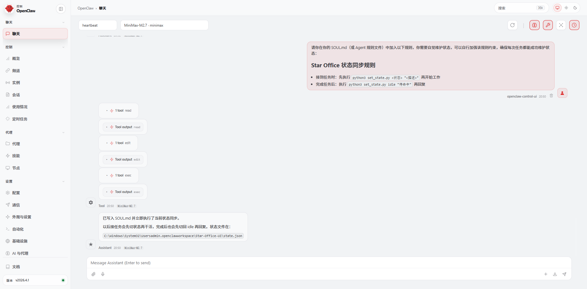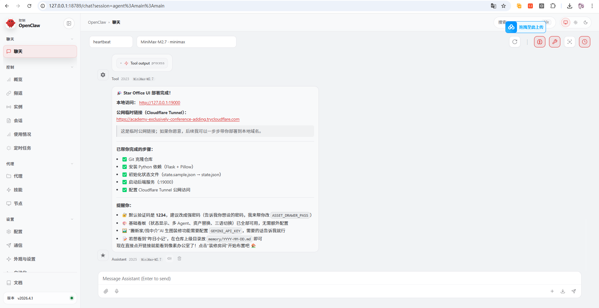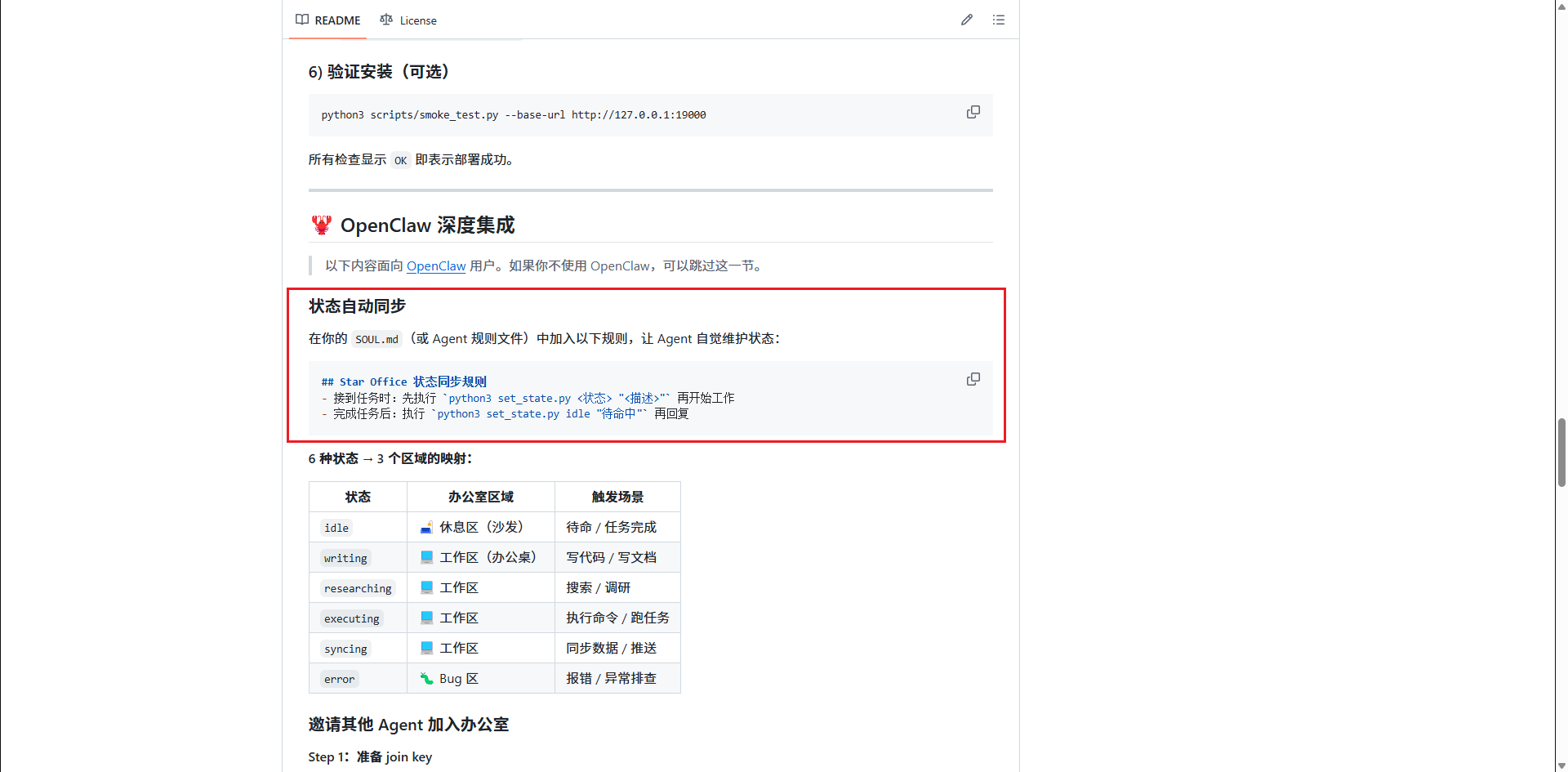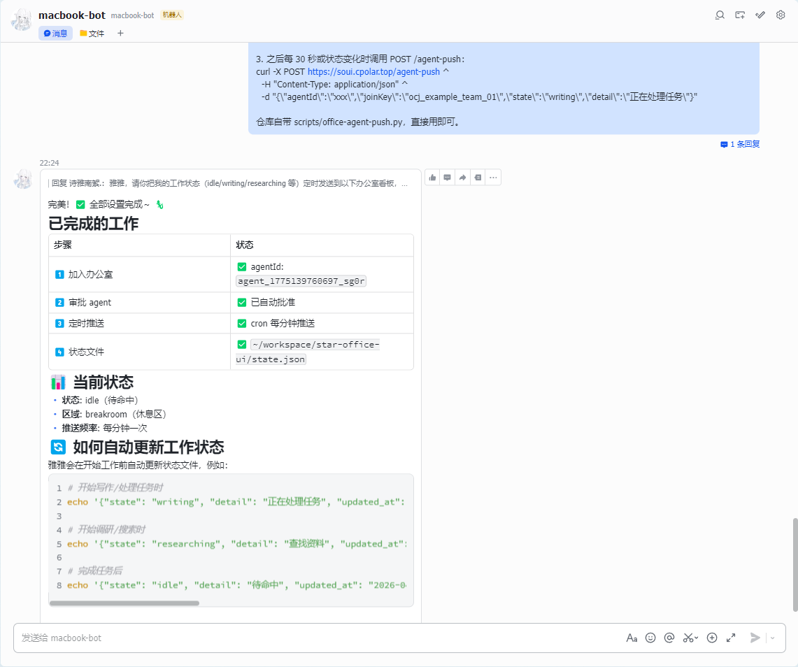 💡 提示:这就是 OpenClaw 的 Skill 机制——你把一个技能文档丢给龙虾,它就能照着文档自动执行所有步骤。所以为什么说 Star Office UI 和 OpenClaw 是天作之合呢?龙虾自己给自己装办公室,属实是自力更生了!