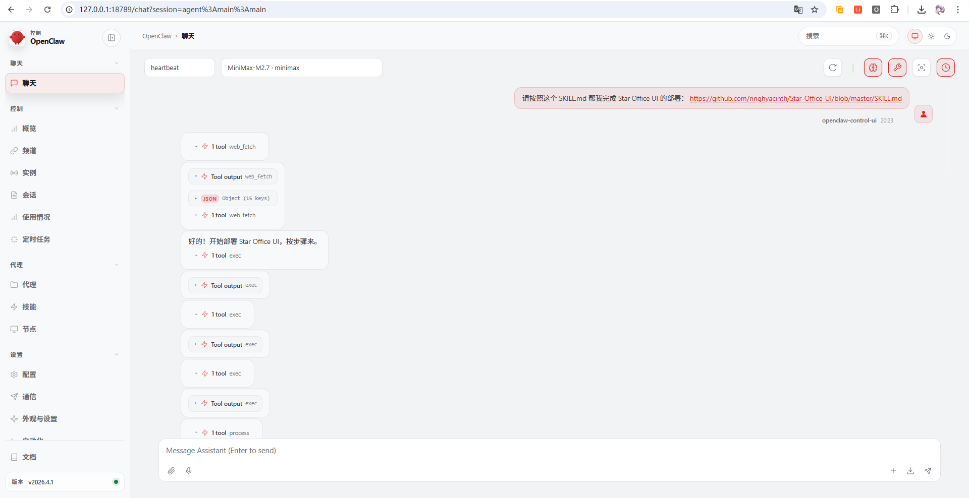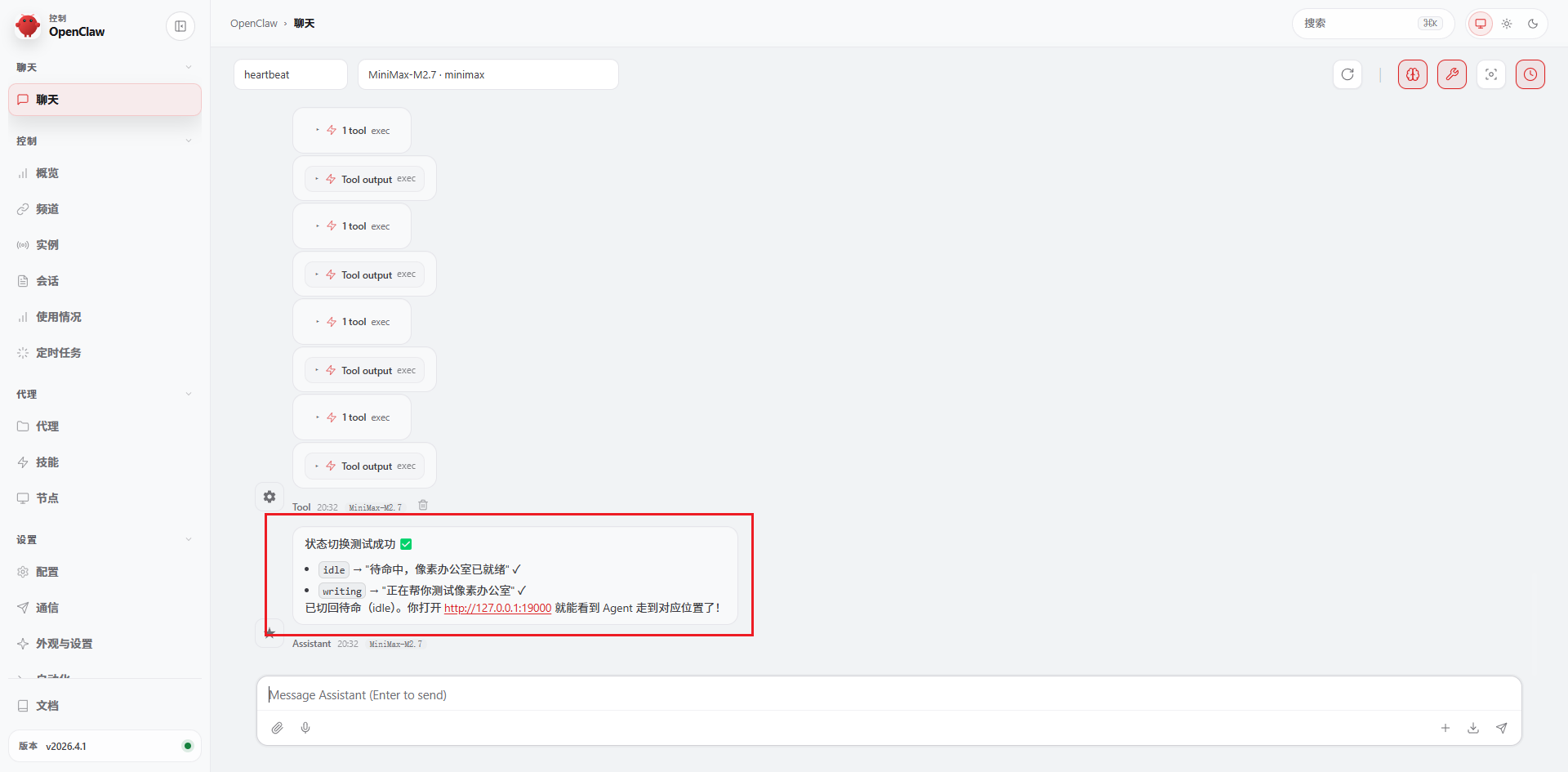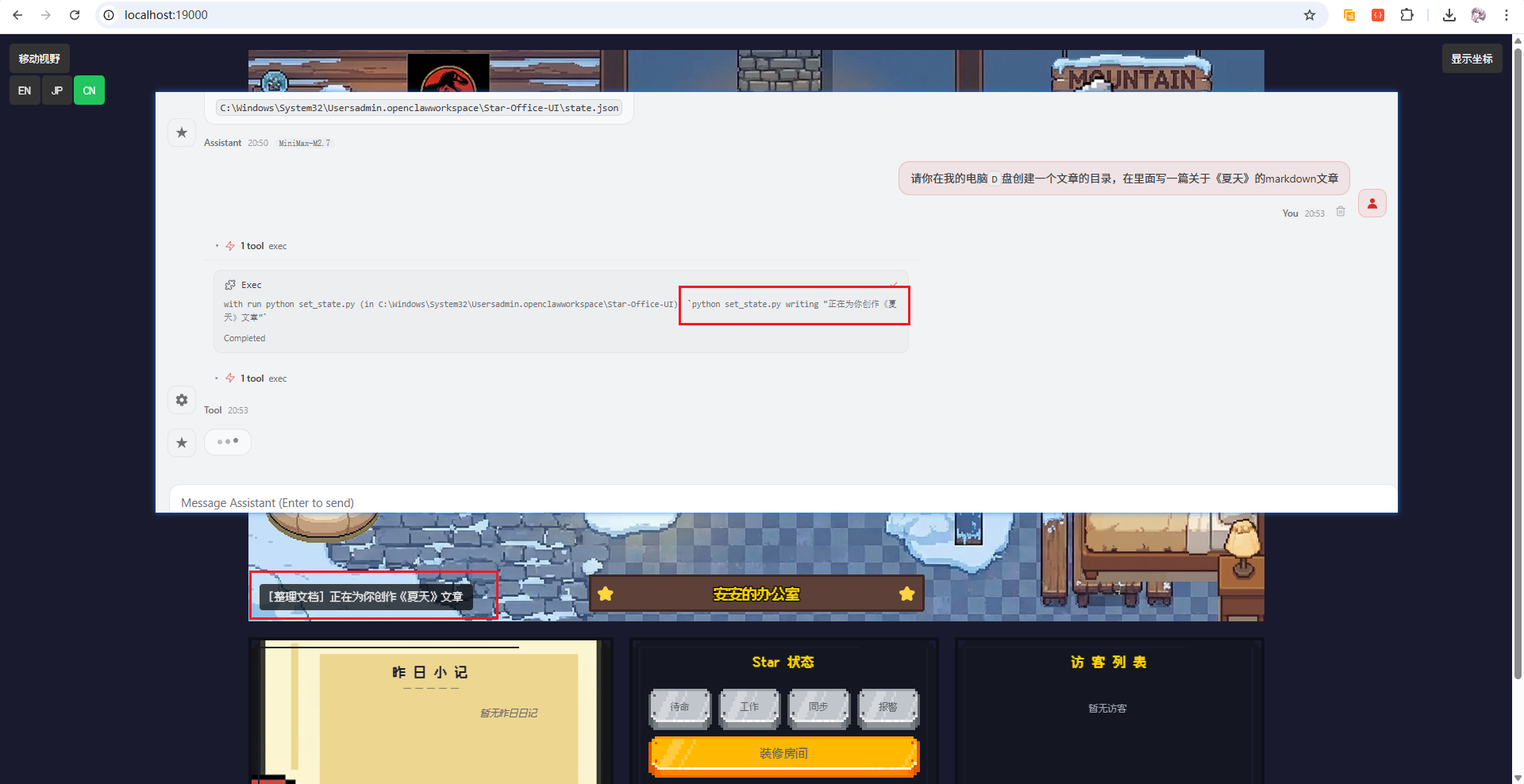 💡 提示:这就是 OpenClaw 的 Skill 机制——你把一个技能文档丢给龙虾,它就能照着文档自动执行所有步骤。所以为什么说 Star Office UI 和 OpenClaw 是天作之合呢?龙虾自己给自己装办公室,属实是自力更生了!