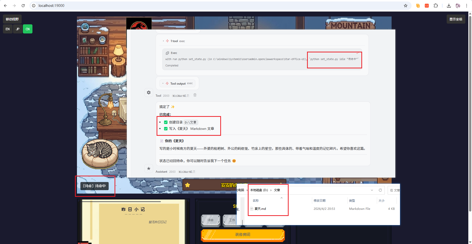 能够看到,它成功地创建了目录,写了一篇文章,还更新了任务前后的状态!如果你接入了消息平台,很长时间没看到它的动静,只需随手打开这个网页看一眼,就再也不用担心它到底是死机了,还是在闷头干大活儿啦!