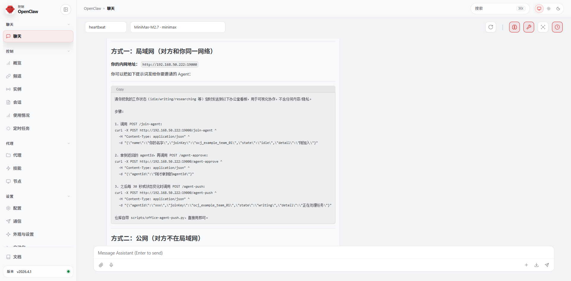 前面我们已经配置好了cpolar的固定域名,接着我们就用这个固定域名让不在同一局域网的agent加入试试吧!以我家里mac上部署的openclaw为例(注意替换提示词中的域名地址):