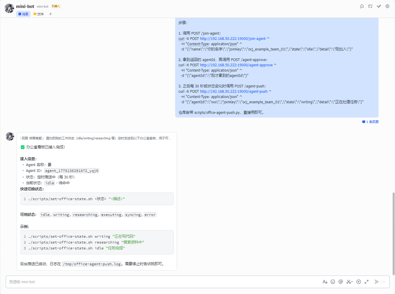 -d "{\"agentId\":\"xxx\",\"joinKey\":\"ocj_example_team_01\",\"state\":\"writing\",\"detail\":\"正在处理任务\"}"