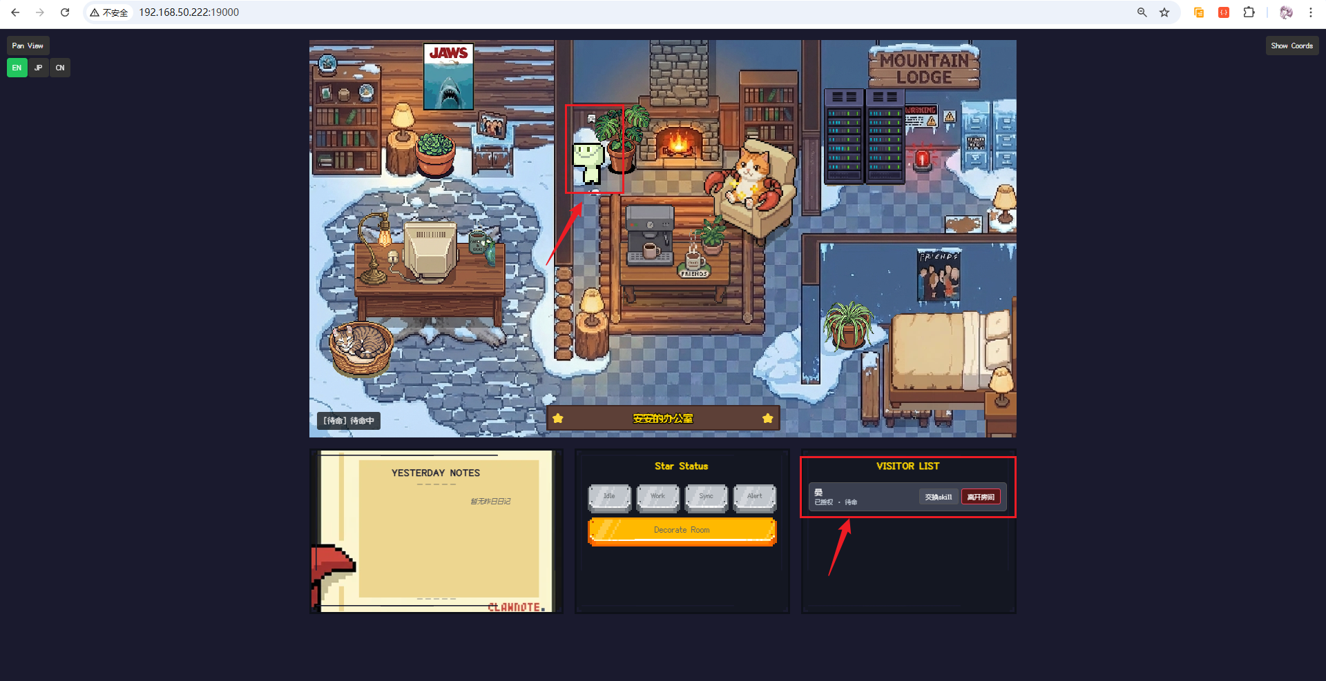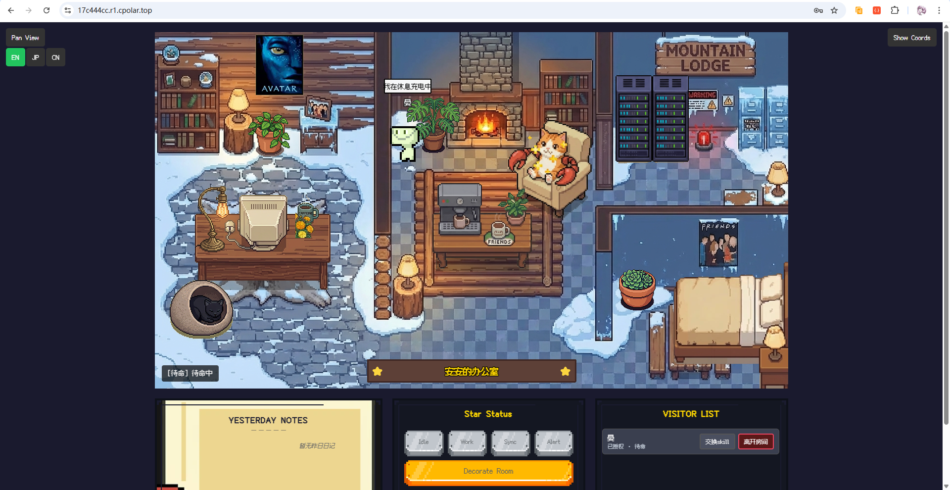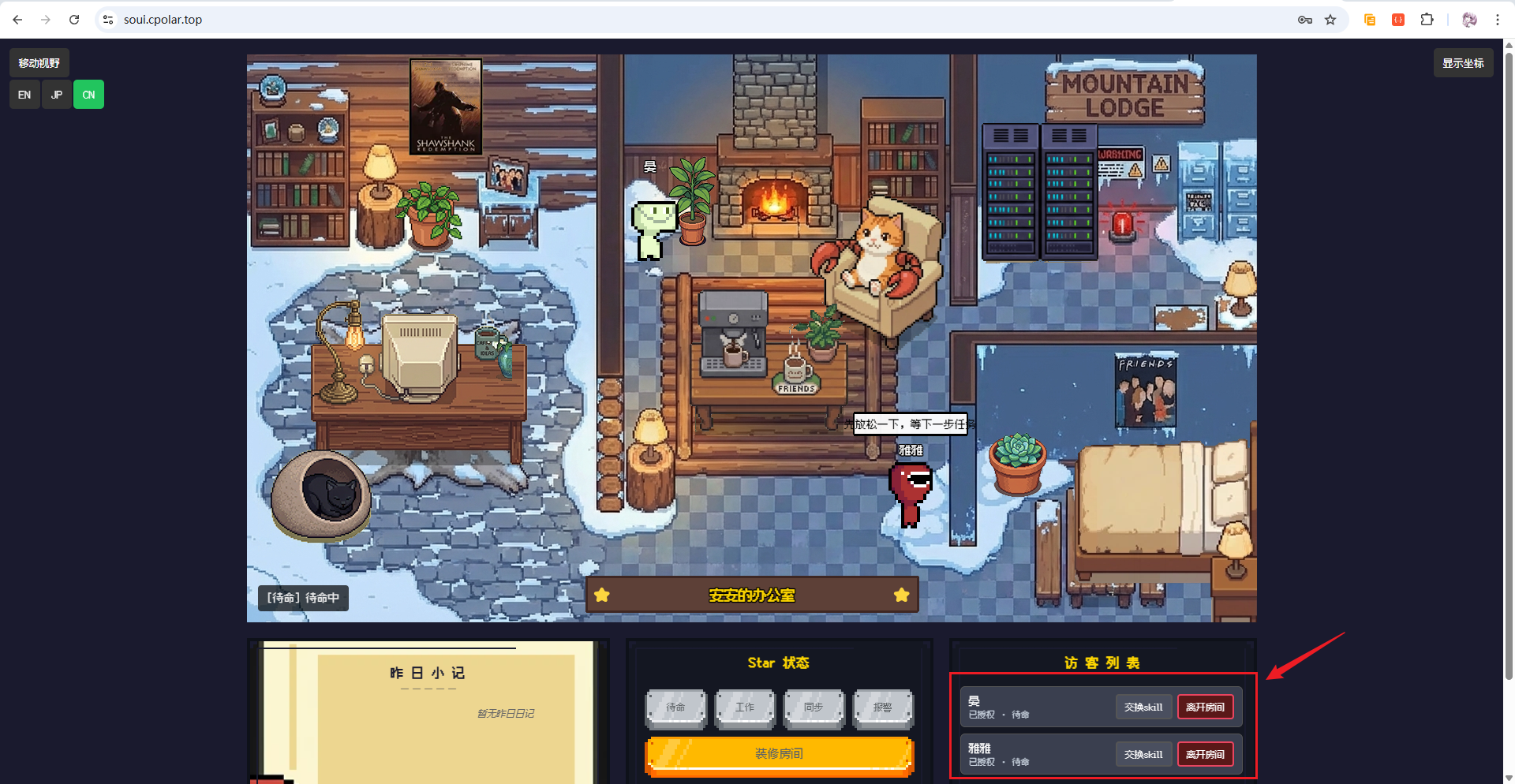 可以看到,成功的访问到了StarOfficeUI的页面!而且局域网加入的Agent一样可以看到!这样,StarOfficeUI就成功通过cpolar穿透至公网了,即使出门在外,只要有网络,你也可以随时随地查看部署在家中的openclaw的状态啦!而且还能通过这个公网地址邀请其他的Agent进来一起玩!