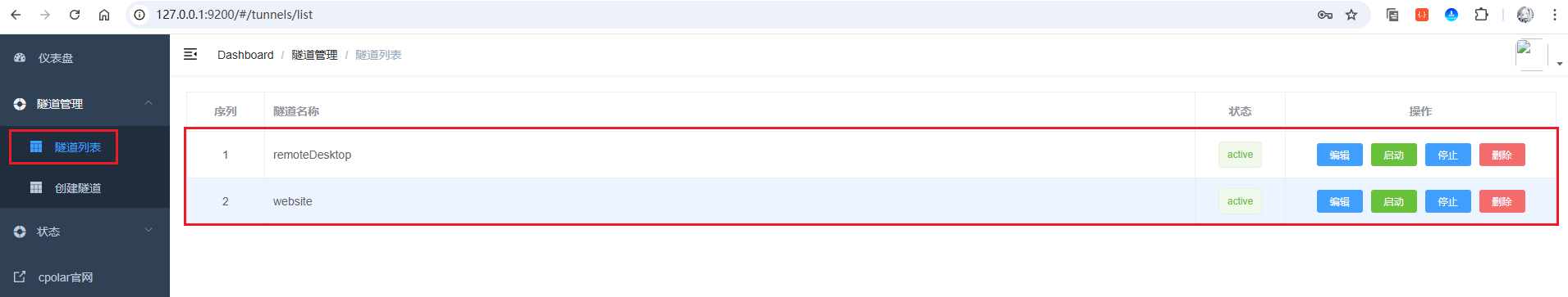 点击左侧菜单栏的【隧道管理】,展开进入【隧道列表】页面,页面下默认会有 2 个隧道: