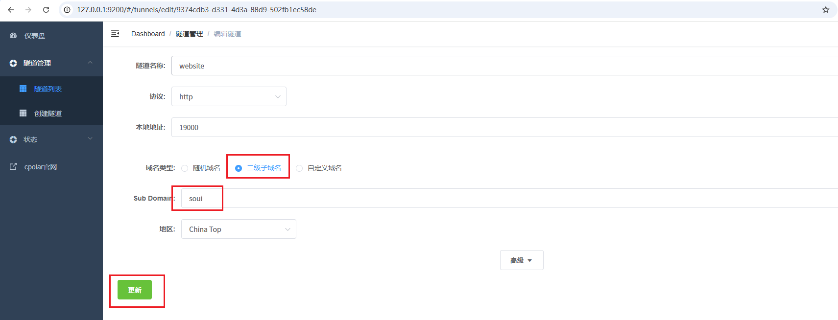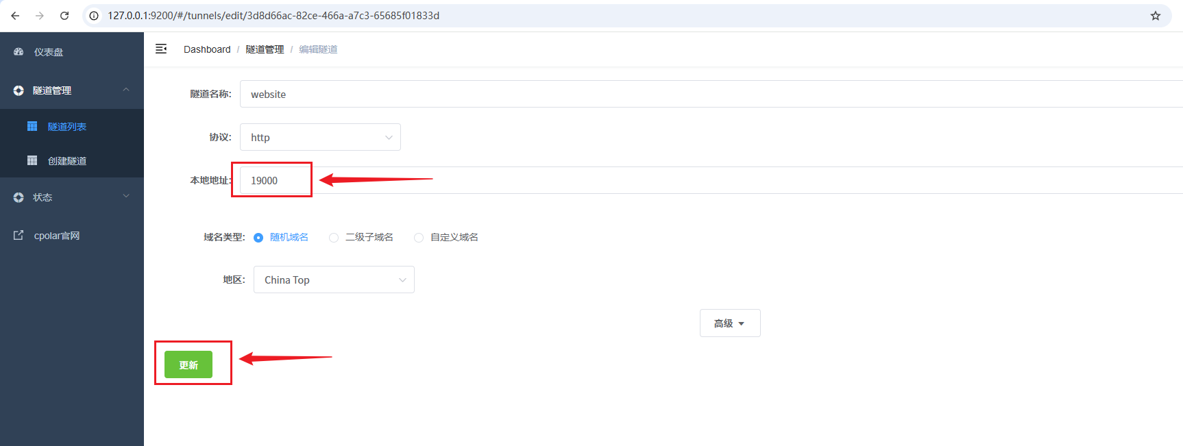 点击编辑【website】的隧道,设置一个隧道名称,协议选择【http】,本地地址填写StarOfficeUI的访问端口【19000】,地区这里选择的【China Top】,最后点击更新: