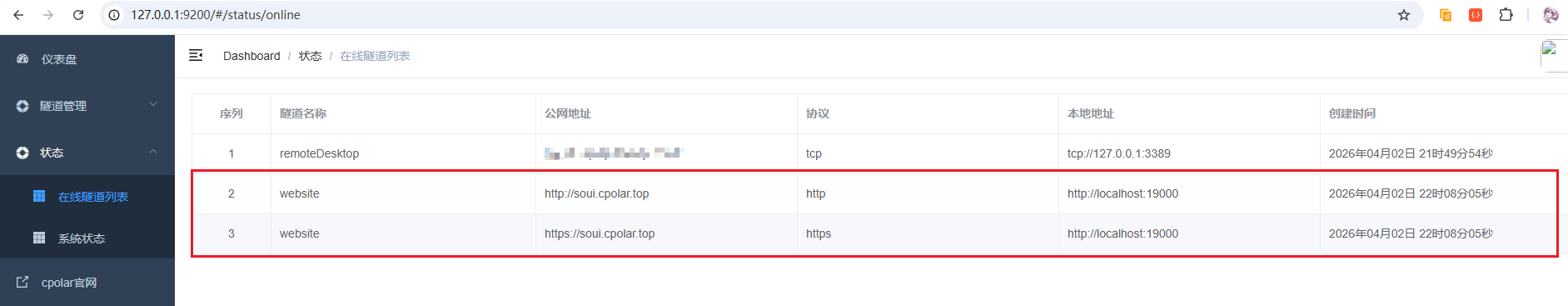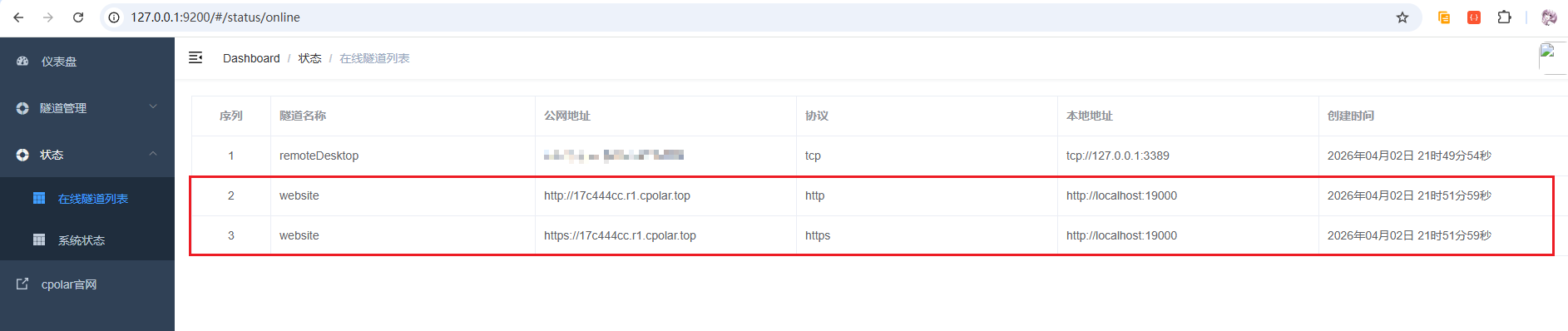 接着来到【状态】菜单下的【在线隧道列表】可以看到隧道名称为【website】的公网地址已经变更为【二级子域名+固定域名主体及后缀】的形式了:
