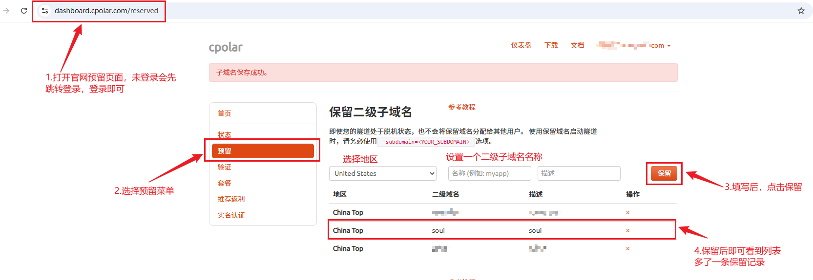 选择【预留】菜单,即可看到【保留二级子域名】项,填写其中的【地区、名称、描述(可不填)`项,然后点击保留按钮,操作步骤图如下: