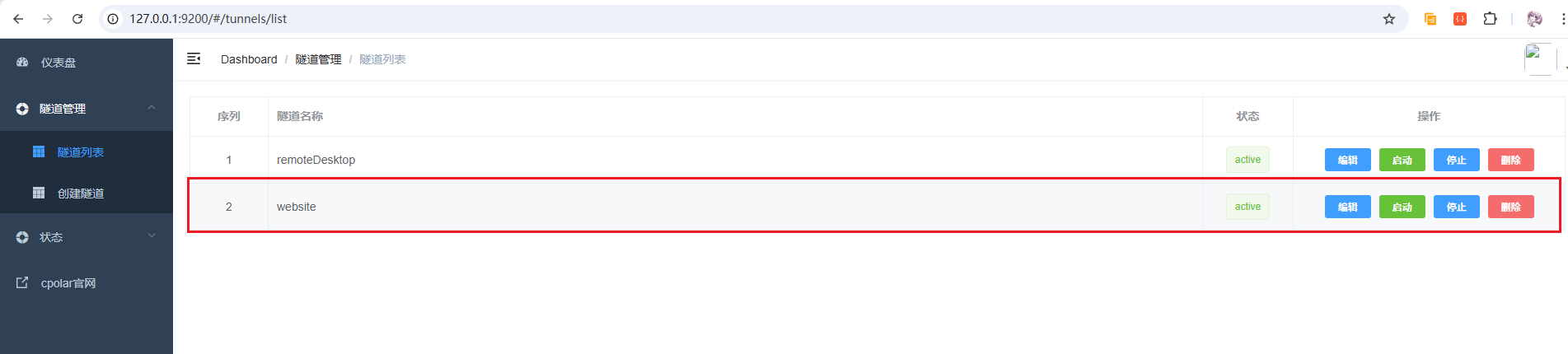 接着,进入侧边菜单栏的【隧道管理】下的【隧道列表】,可以看到名为【website】的隧道,点击【编辑】按钮进入编辑页面: