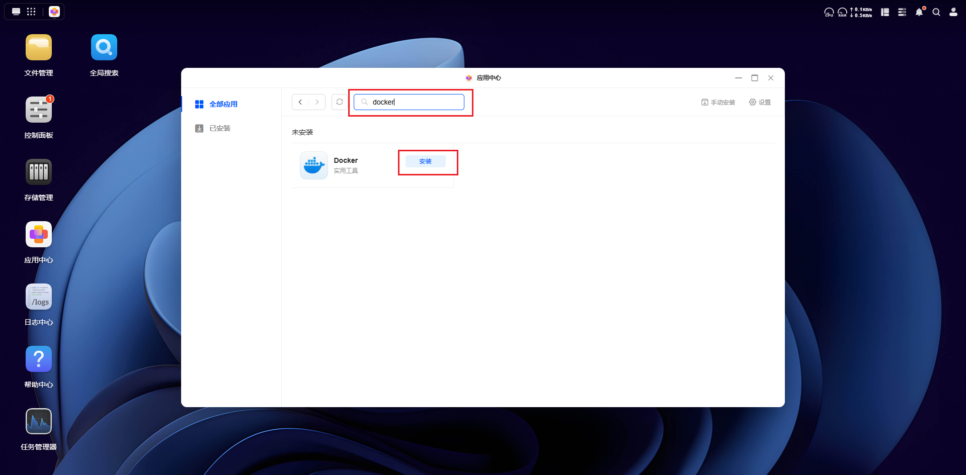打开之后,在里面搜索 Docker。找到应用后直接点安装,等它装完就可以了: