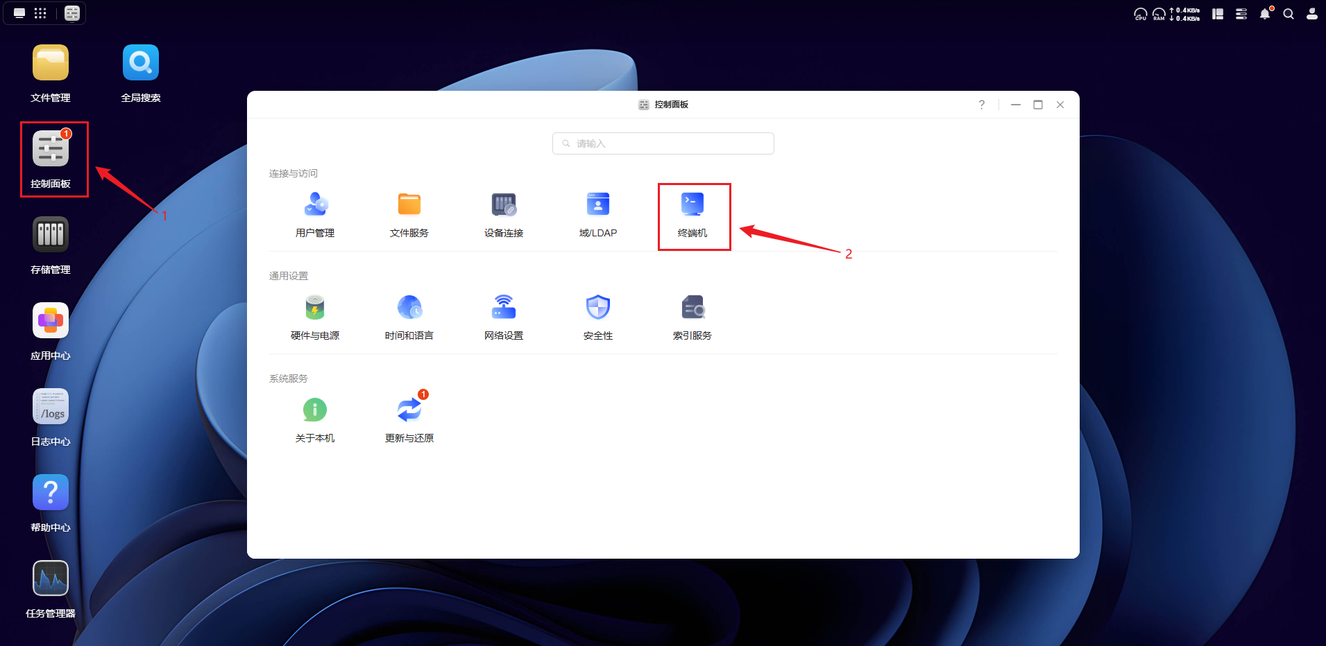 首先,需要先给绿联NAS开启SSH远程登录功能,点击首页的控制面板,然后点击终端机图标,点击进入: