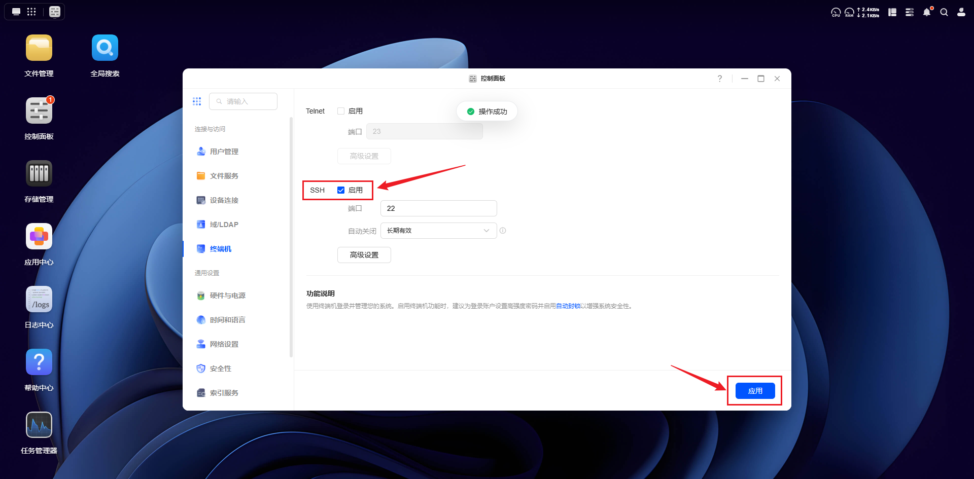 点击勾选SSH功能,然后点击应用(注意:SSH密码为登录的密码,建议密码一定要设置强密码,特别是公网环境下!!):