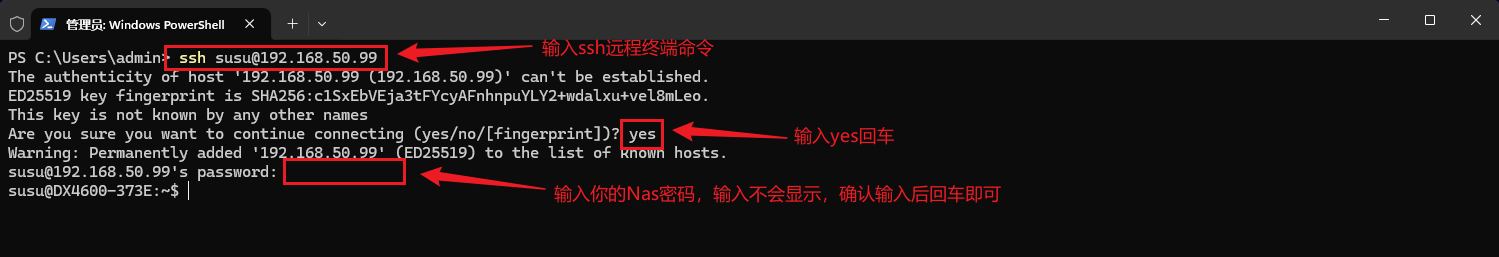 开启完成后,在电脑端打开终端工具。Windows 可以直接使用 PowerShell,电脑上摁【Win + X】键,选择终端(管理员),macOS 和 Linux 则使用系统自带终端即可。然后输入下面的命令连接到你的 NAS: