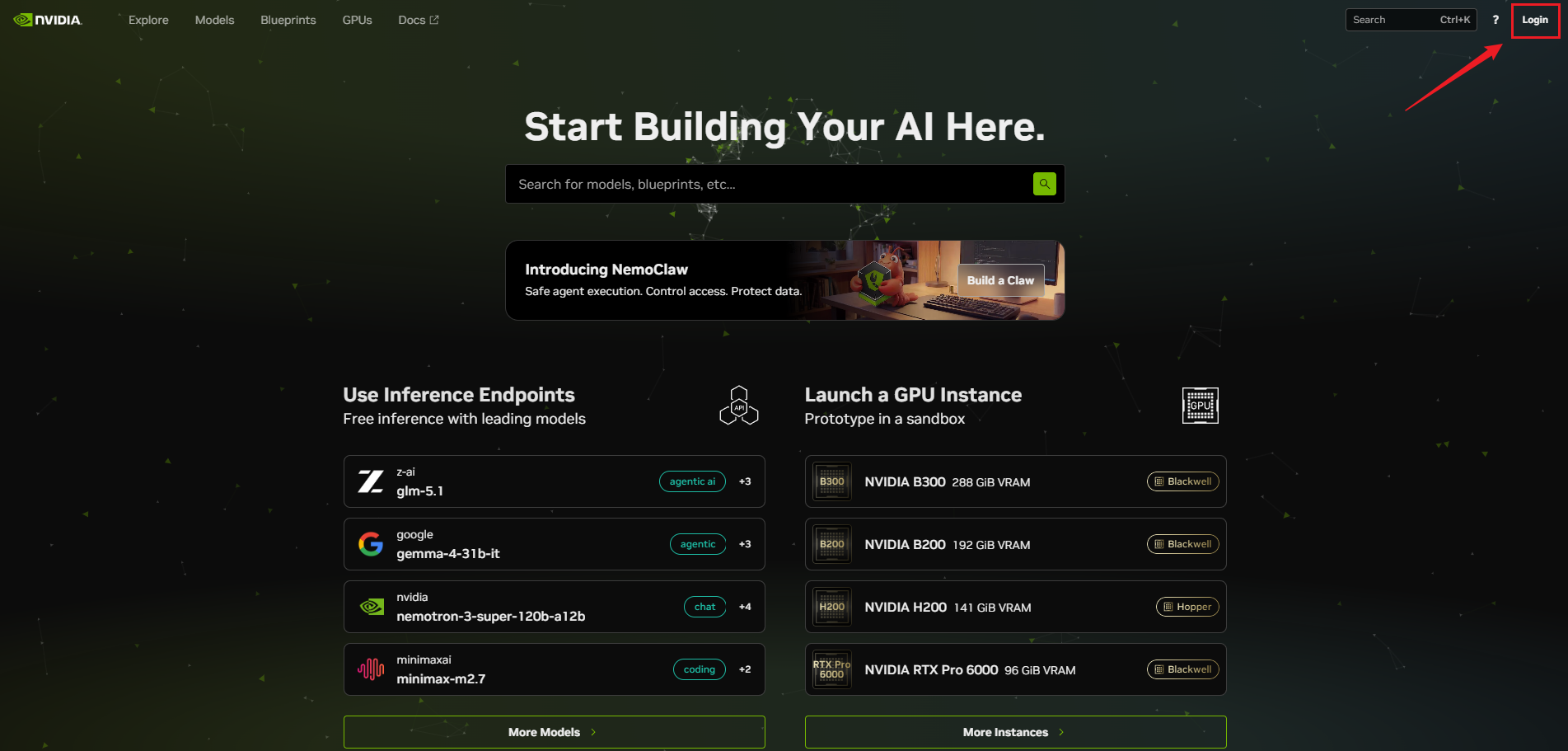 首先,打开 NVIDIA Build 页面,点击右上角的 Login 按钮:
