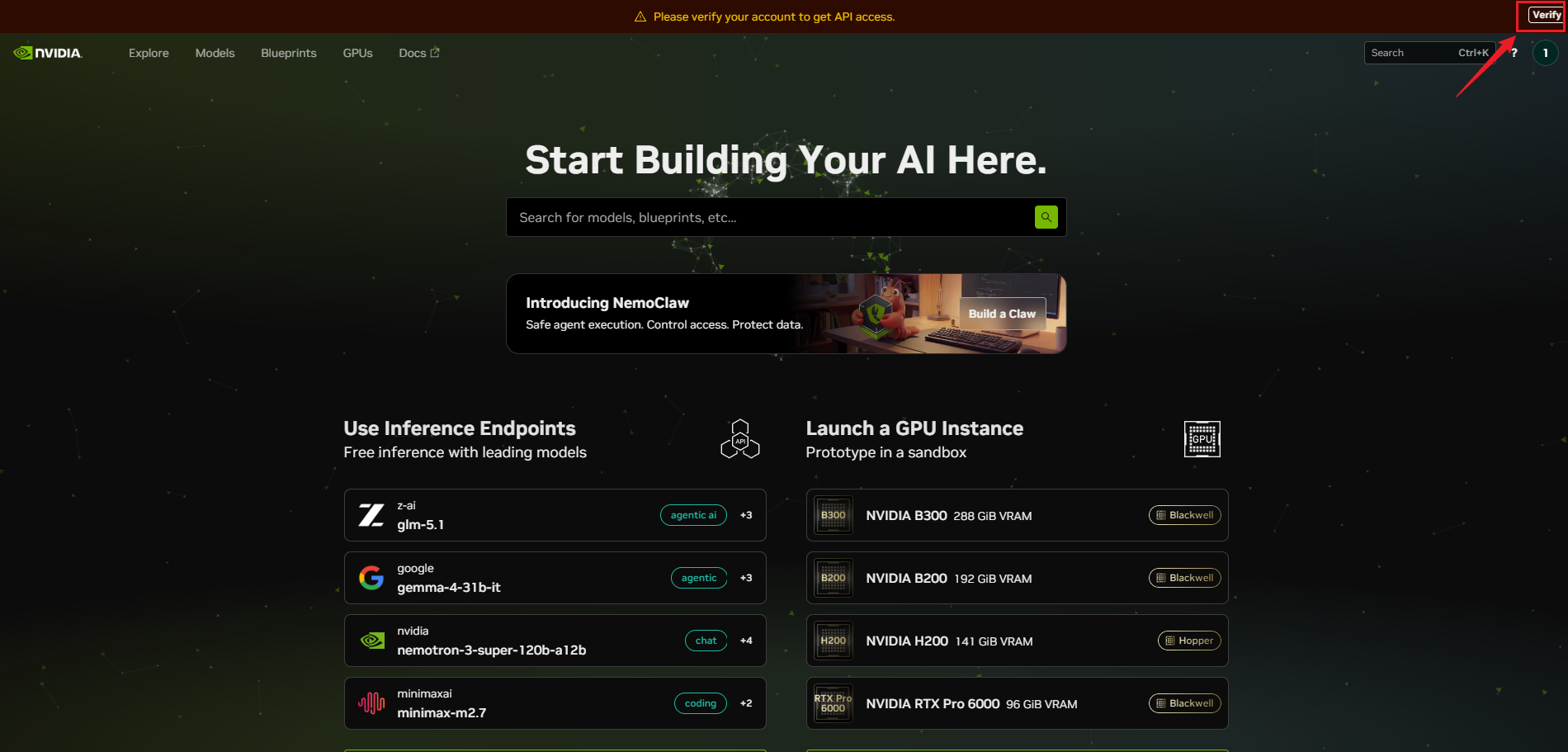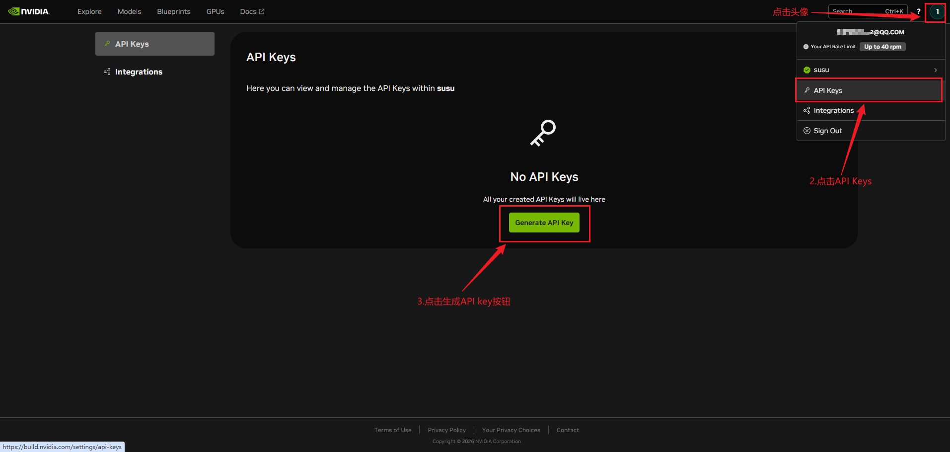 前面已经把 CLI Proxy API 部署好了,接下来就可以开始准备上游渠道。这里先以 NVIDIA 为例,在正式接入之前,需要先准备好 NVIDIA 账号,并生成后面要用到的 API Key。NVIDIA Build 当前仍提供 Get API Key 入口,用于申请开发测试用的 serverless API。