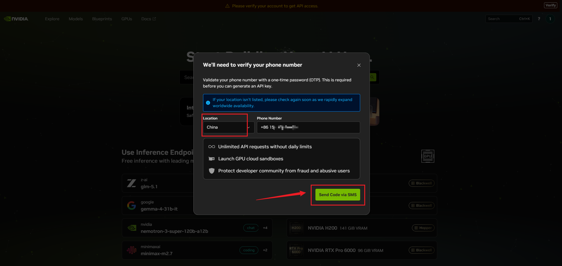 按提示填手机号进行验证,支持国内+86的手机号填写,验证完成后,这个账号就可以继续用来生成 API Key 了: