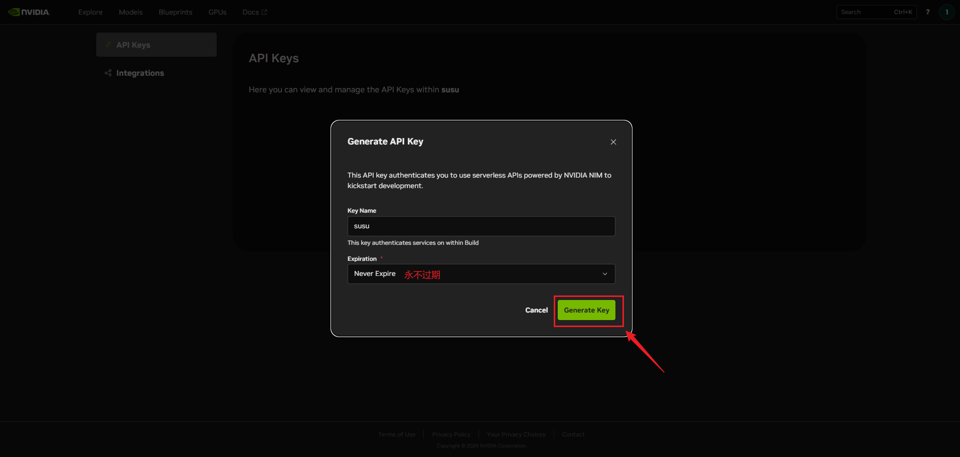 进入后,点击 Generate API Key 按钮,先给这个 Key 起一个名字,再根据自己的需要选择有效期,然后生成即可: