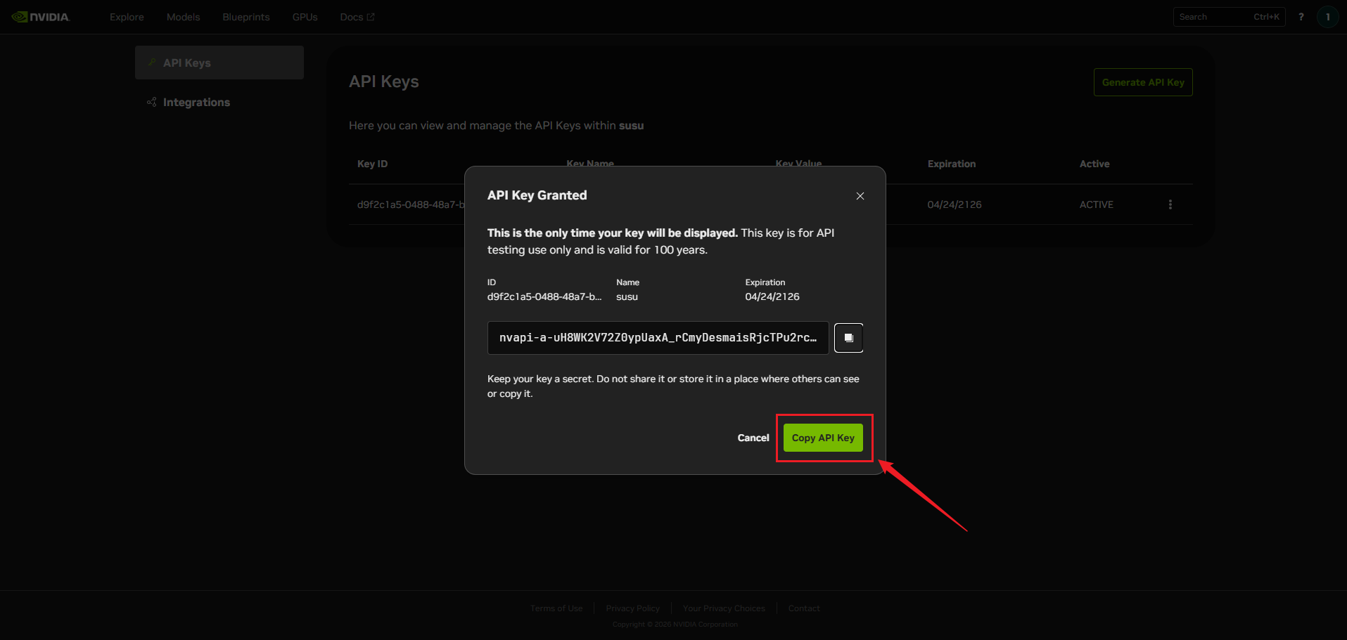生成完成后,页面会给出一串 API Key。把它复制保存好,下一步回到 CLI Proxy API 后台配置 NVIDIA 上游时会用到,如下图: