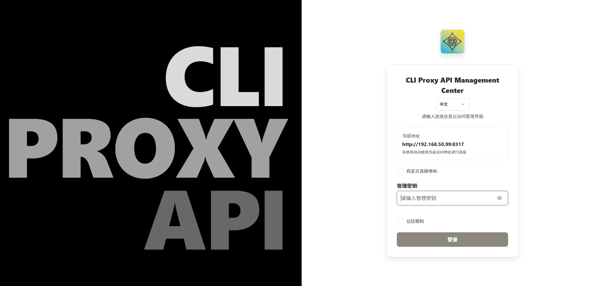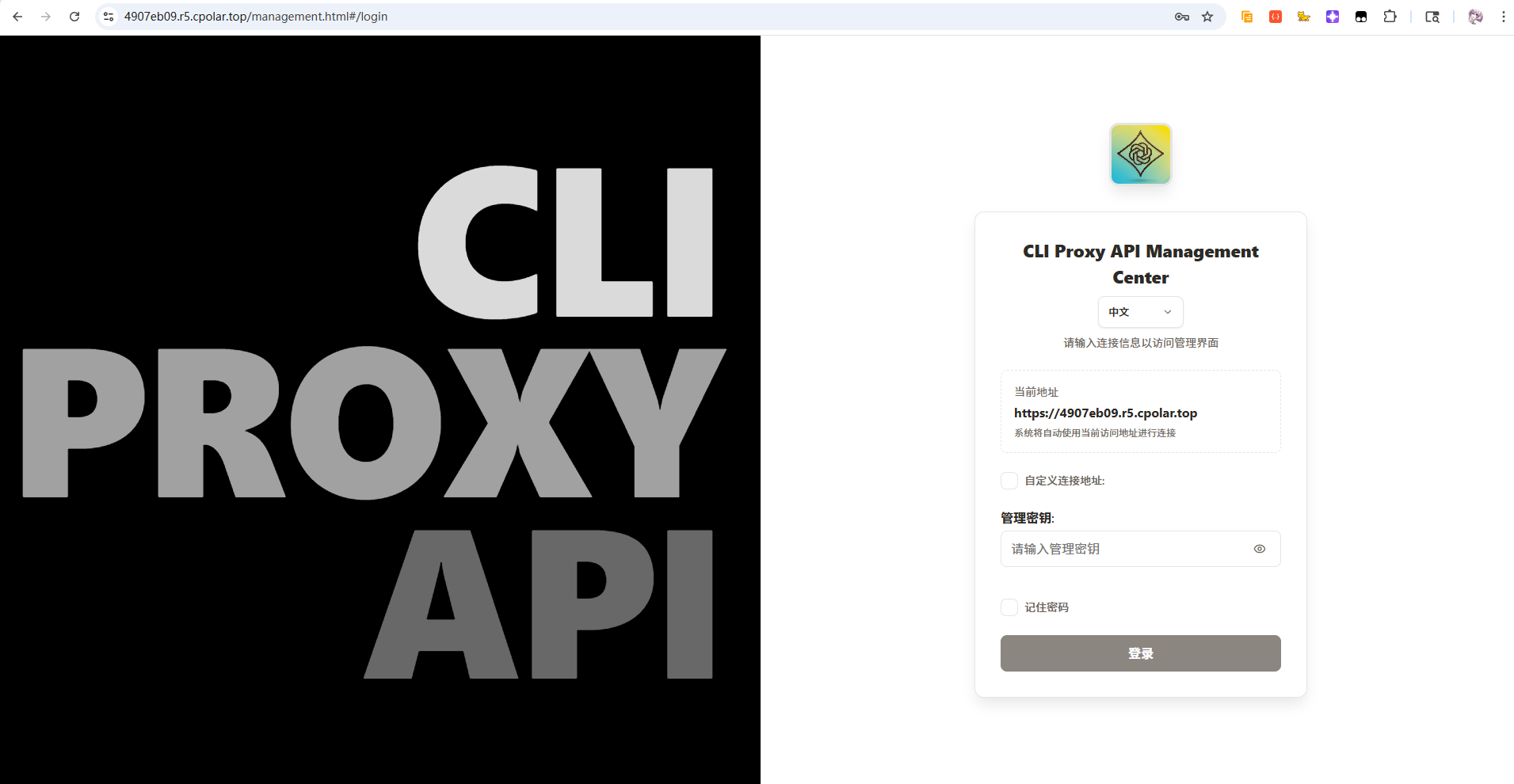 这时候可以直接复制终端里显示的管理页面(登录地址),粘贴到浏览器中打开,就能进入 CLI Proxy API 的登录页面: