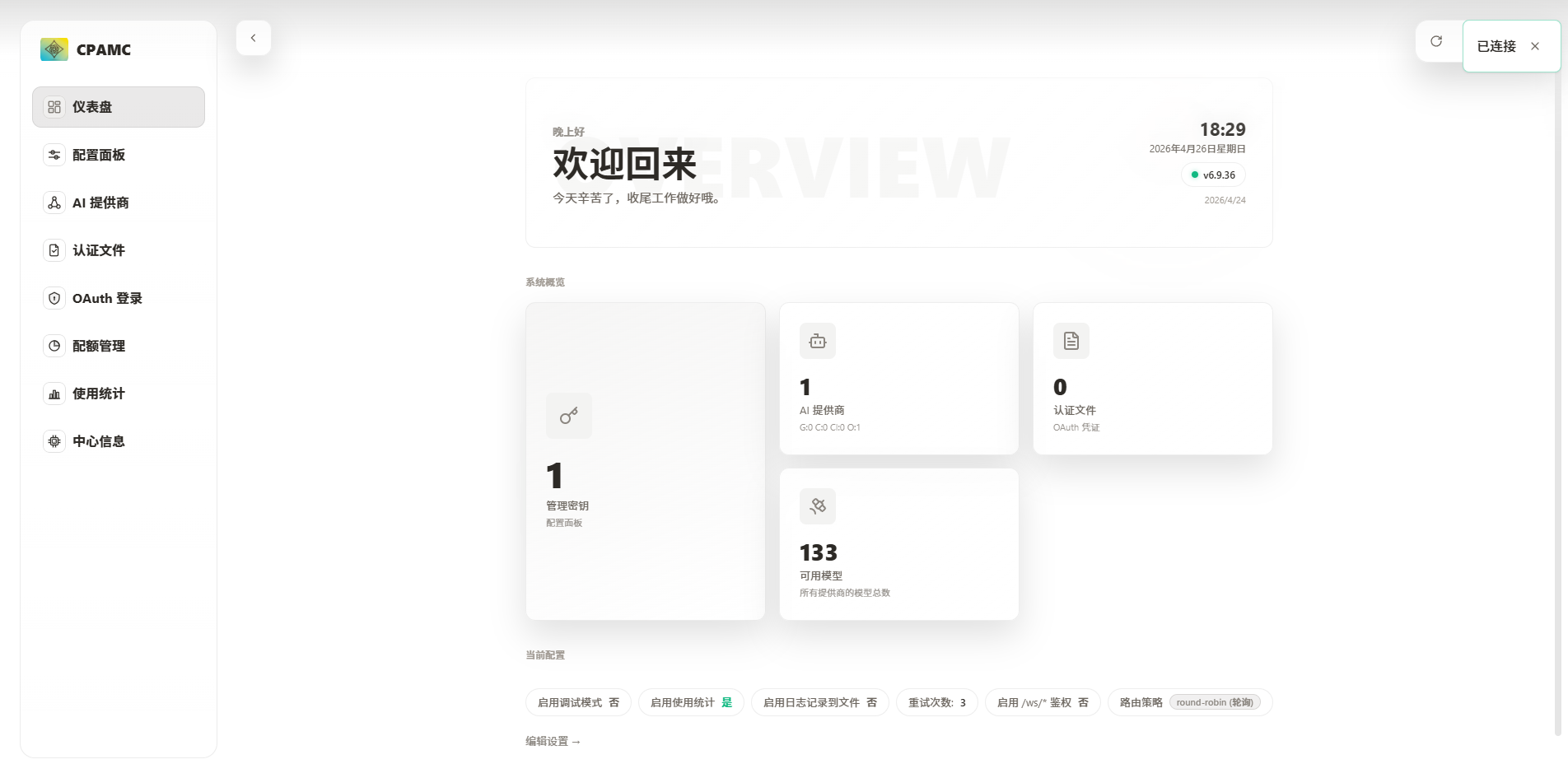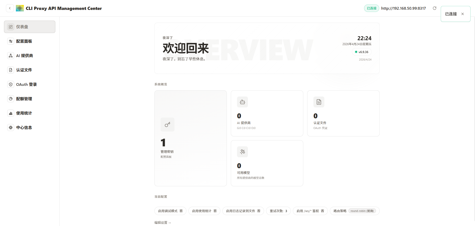 然后再使用终端输出的管理员账号和密码登录后台,进入 CLI Proxy API 的管理界面: