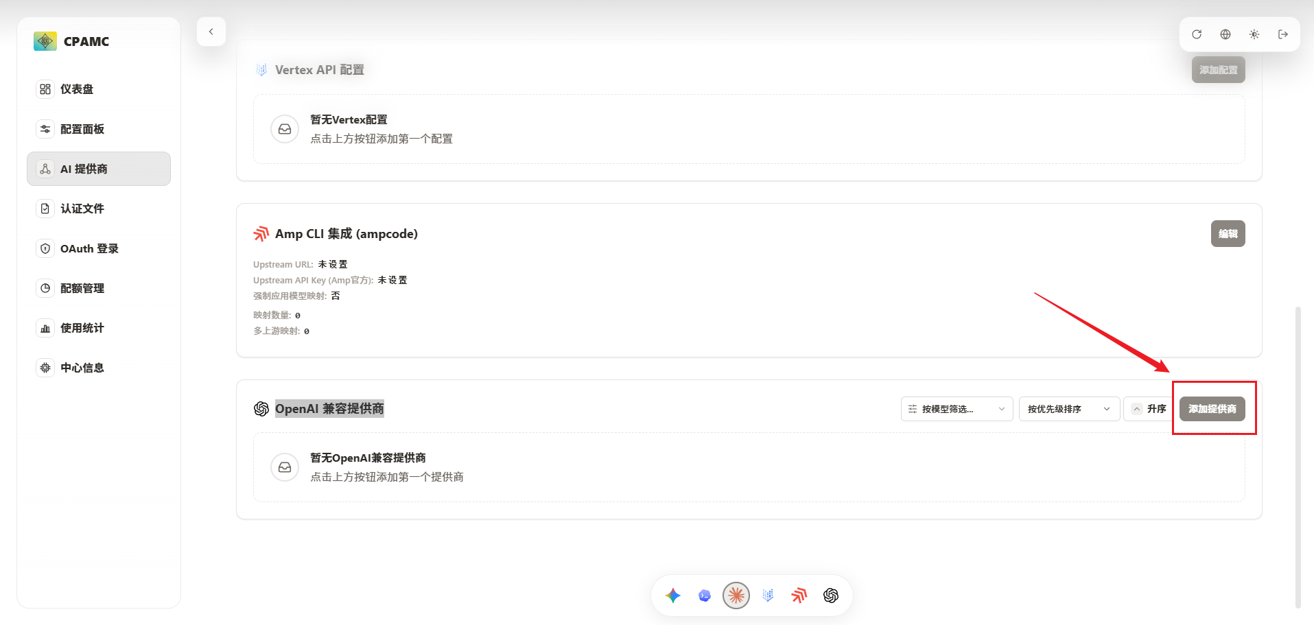 首先,在左侧菜单中找到 AI 提供商。然后向下滚动,在最下方找到 OpenAI 兼容提供商,点击右侧的 添加提供商 按钮。