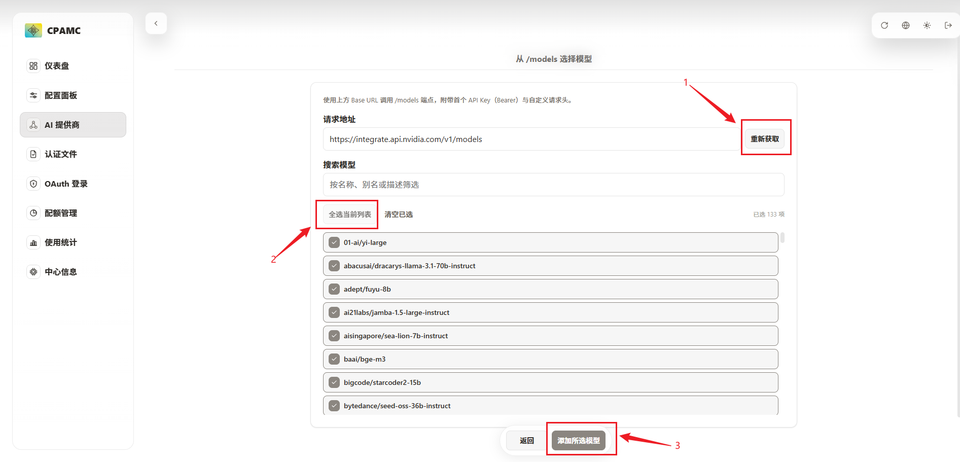点击之后,程序会尝试从当前填写的 Base URL 拉取可用模型列表。如果没有自动显示出来,也可以手动再点一次获取,然后全选模型列表,点击添加: