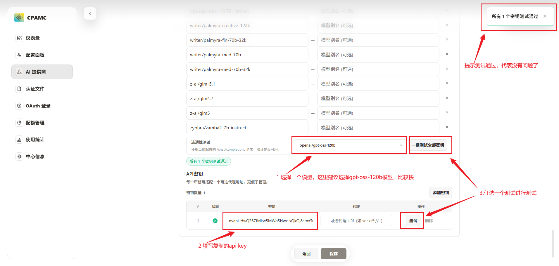 模型添加完成后,继续向下滚动到页面底部,在 API Key 的位置填入前面在 NVIDIA 后台生成的密钥。然后任选一个刚刚添加的模型(推荐选择gpt-oss-120b),先做一次连接测试: