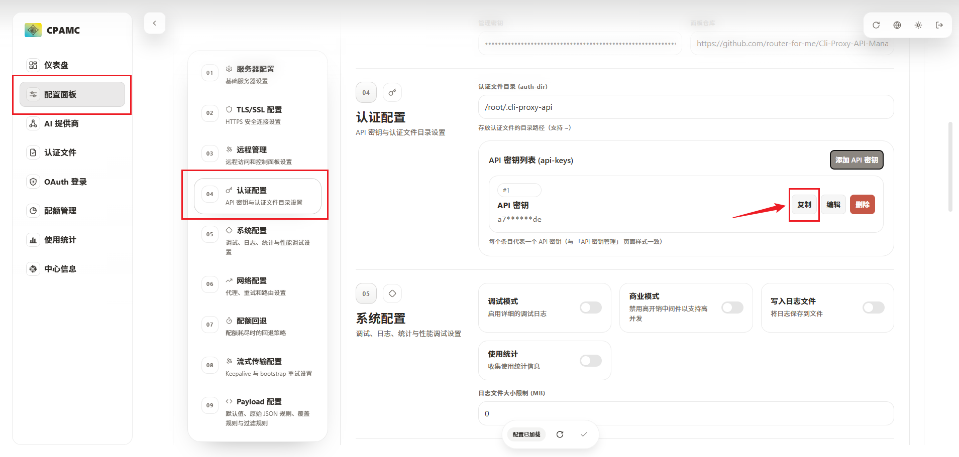 • API Key:填写前面在 CLI Proxy API 后台复制出来的统一 API Key