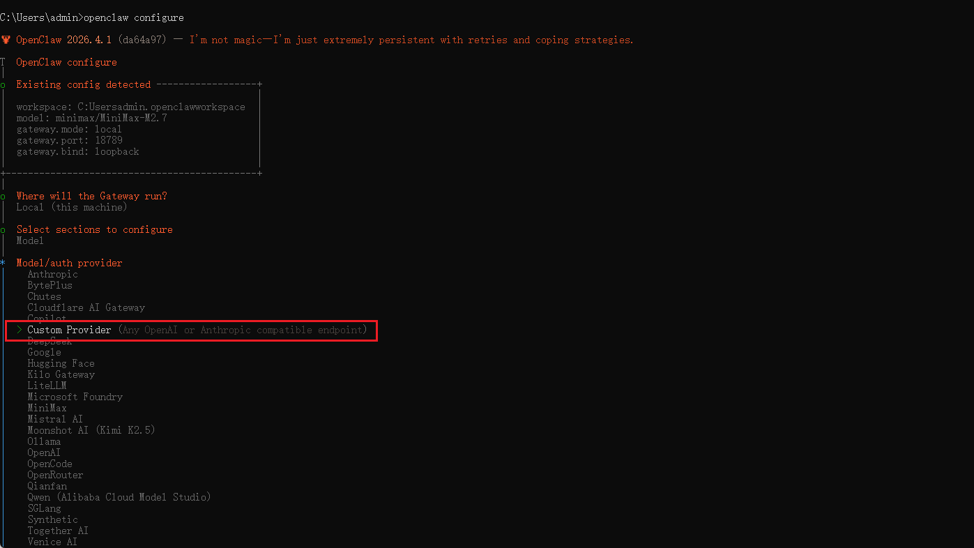 进入配置向导后,先选择 Local,然后进入 Model,接着选择 Custom Provider(自定义提供商),如下图所示:image-20260426172040881