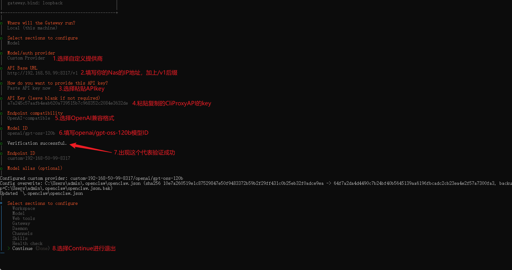 当界面中出现 Verification successful. 提示时,就说明当前这组配置已经验证通过。最后选择 Continue (Done) 保存并退出即可。