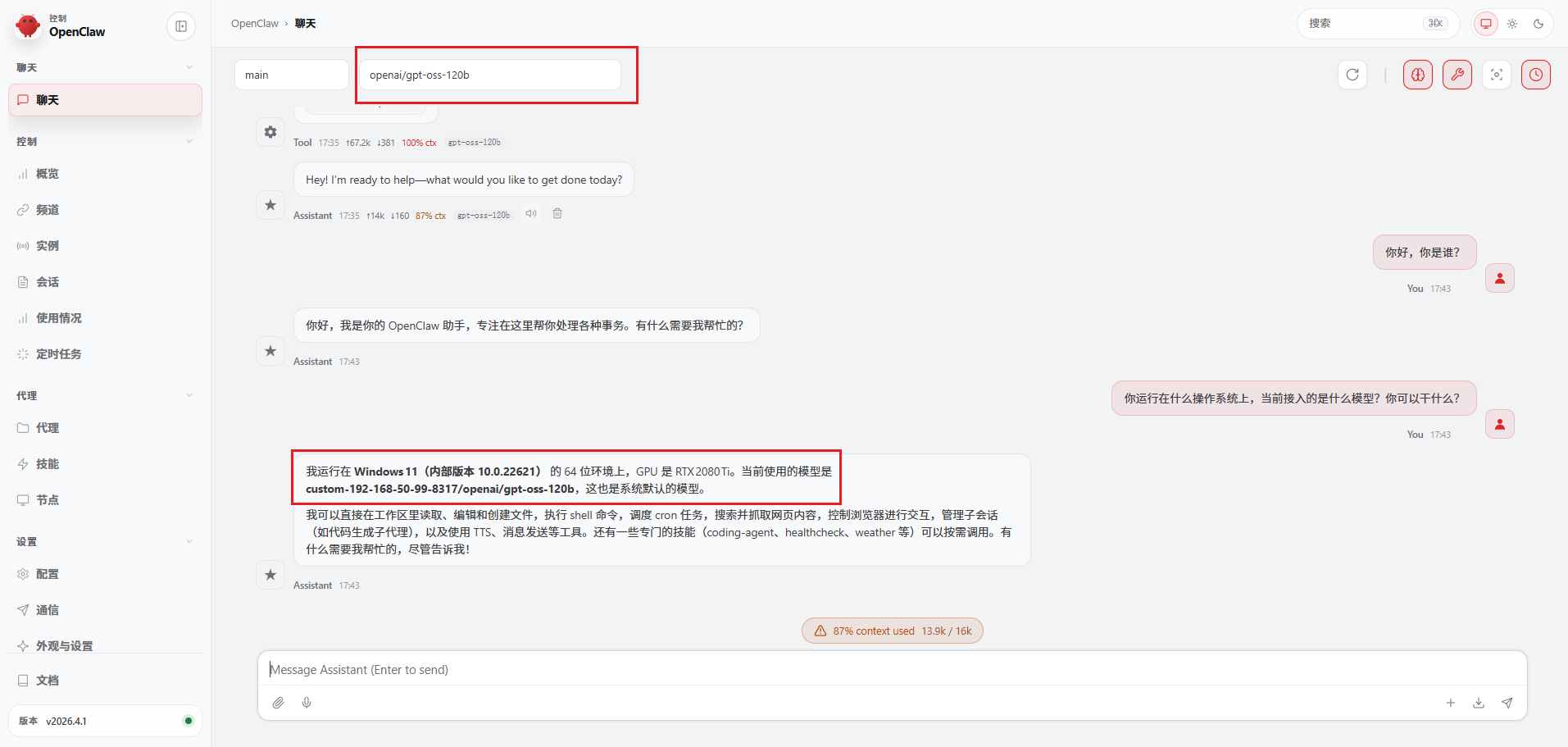 完成配置后,如果当前会话还没有切换到刚刚新增的模型,可以先重启一下网关,或者直接在网页端修改当前会话使用的模型,再发送一次 /new 重新开启新会话。处理好之后,就可以直接开始对话测试了。