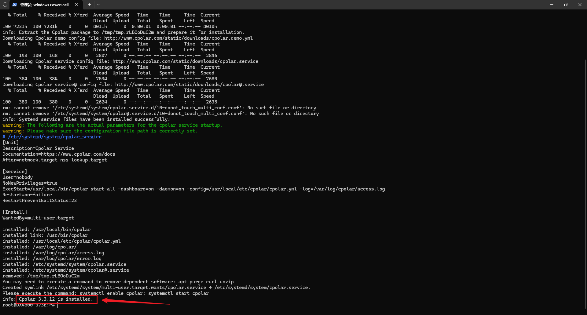 先回到前面连接绿联 NAS 时使用的 PowerShell 终端,执行下面这条命令,一键安装 cpolar: