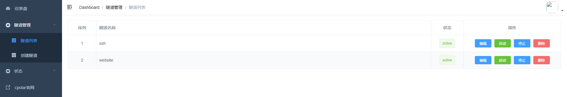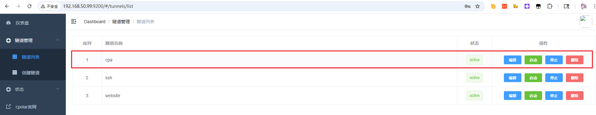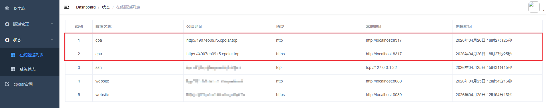 接下来,回到本地 cpolar 管理界面,进入左侧菜单中的隧道管理 → 隧道列表,找到前面创建好的 cpa 隧道: