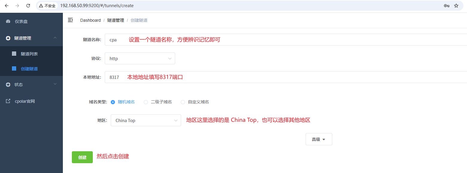 创建时,先设置一个方便辨识的隧道名称,例如 cpa。然后按下面的方式填写参数:
