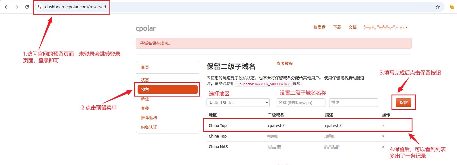 首先,登录 cpolar 控制台,进入预留页面,然后选择其中的保留二级子域名。在这里填写好地区、名称以及描述(描述可以不填),最后点击保存即可: