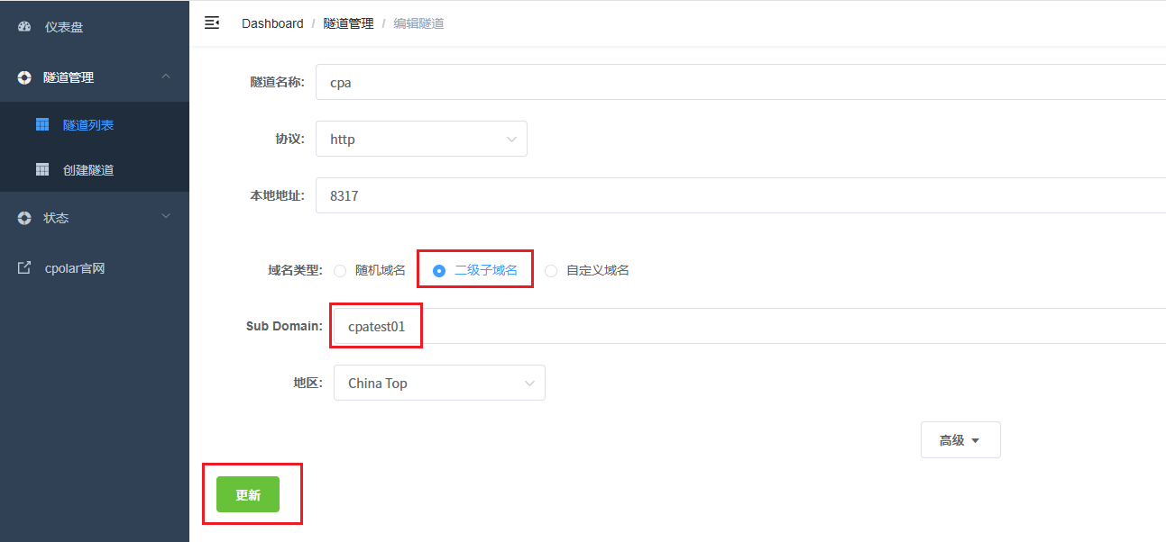点击右侧的【编辑】按钮,把域名类型改为“二级子域名”,在 Sub Domain 栏中输入你之前保存好的名称(例如 cpatest01),然后点一下 【更新】: