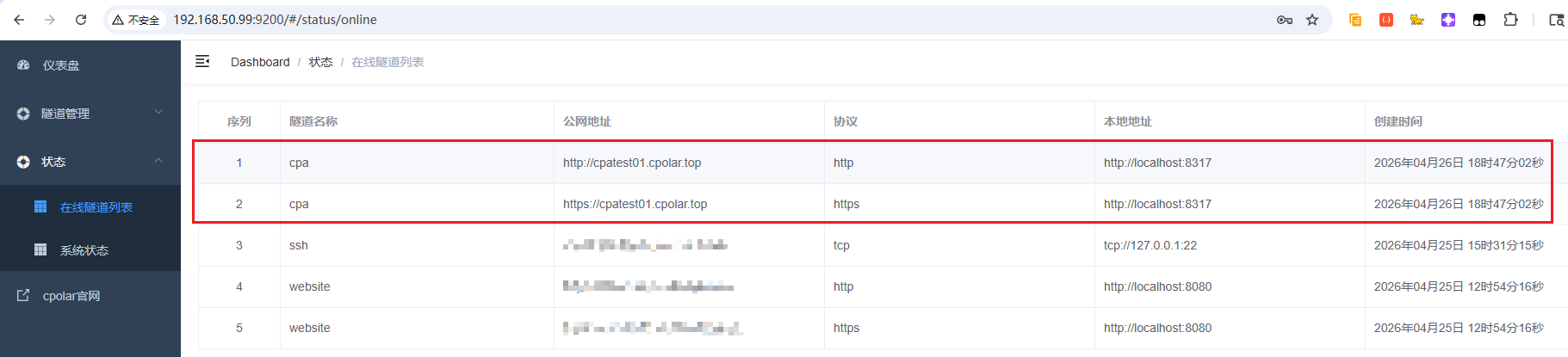 创建成功后,继续进入 状态 > 在线隧道列表,就可以看到刚刚生成的公网访问地址。通常会同时生成两条记录,一条是 HTTP,另一条是 HTTPS