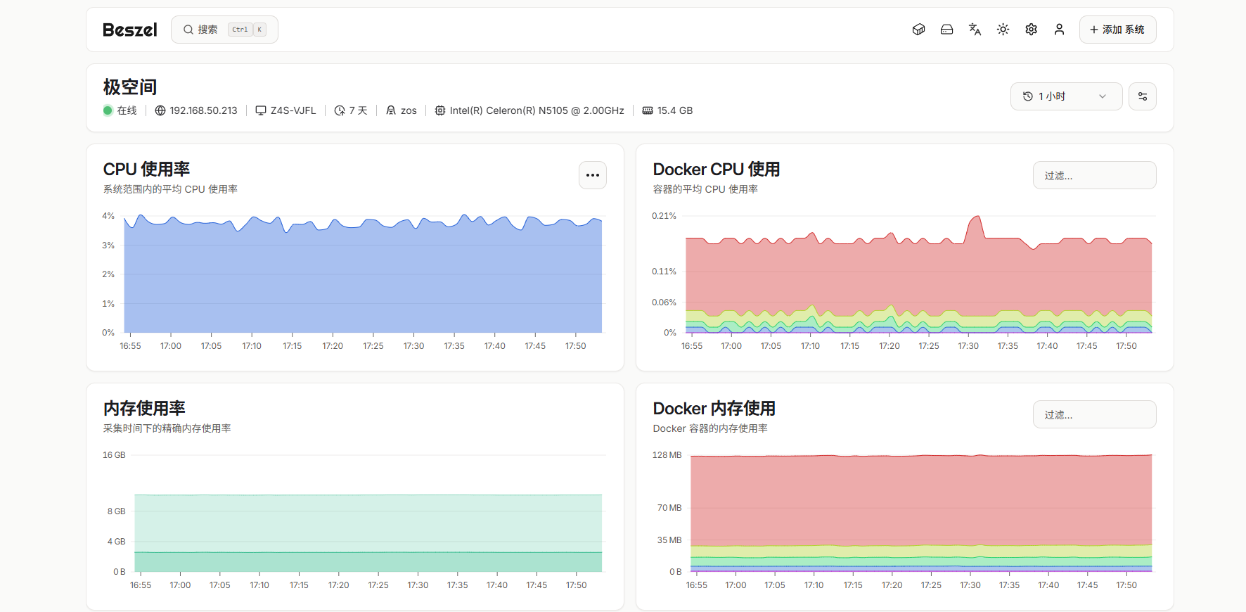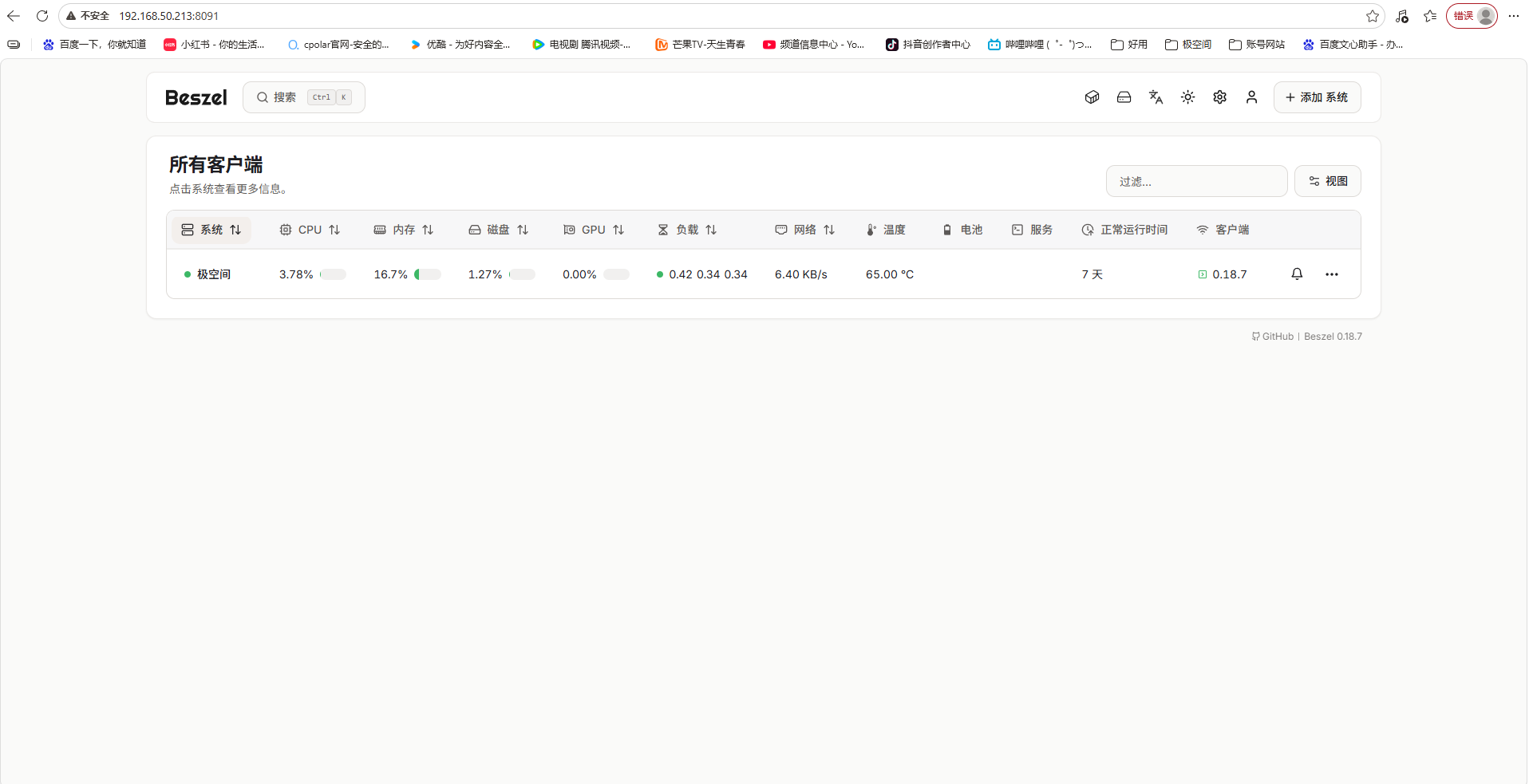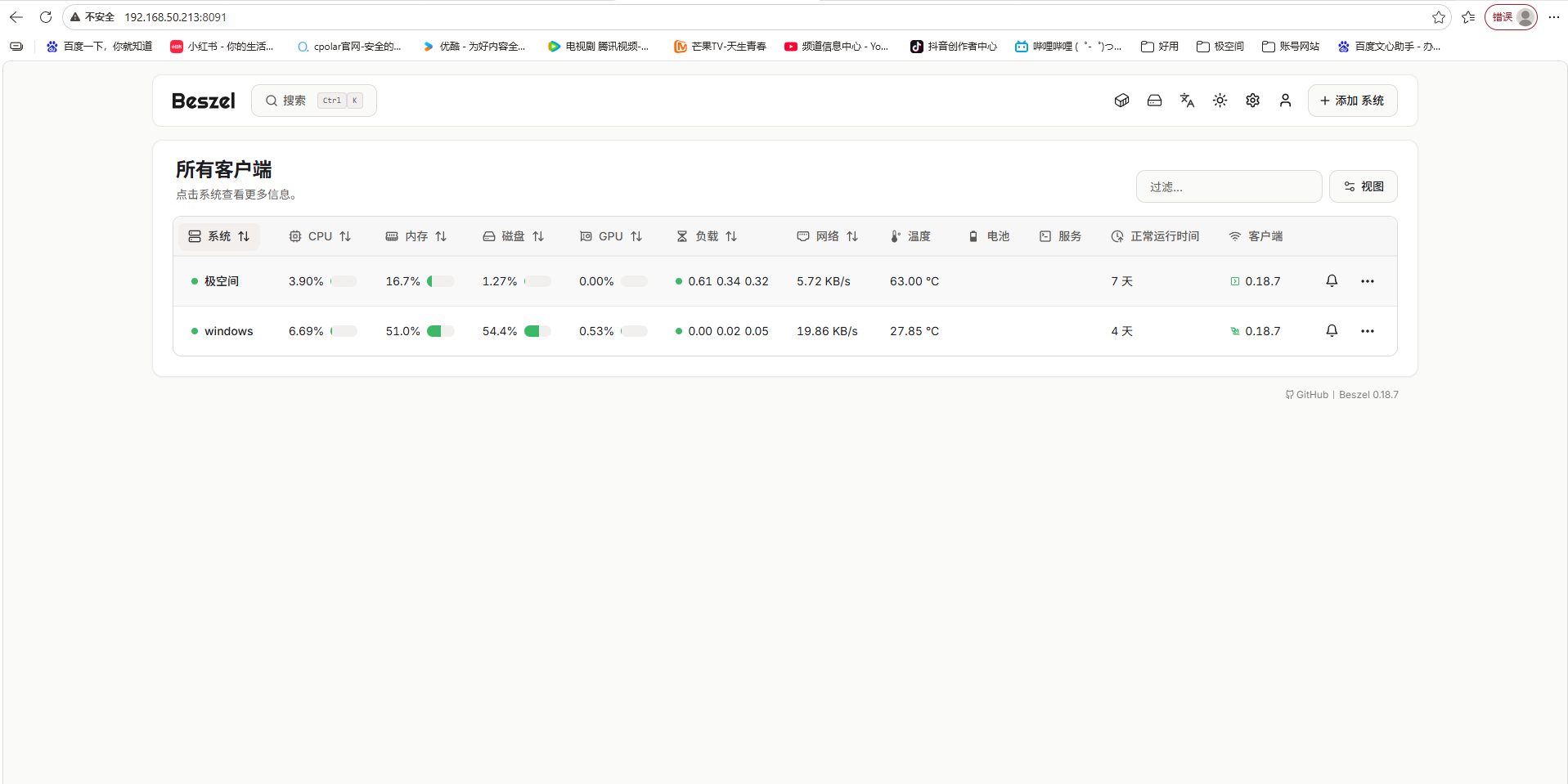 部署完成后,在浏览器中输入 http://极空间IP:8091 就能看到beszel的界面: