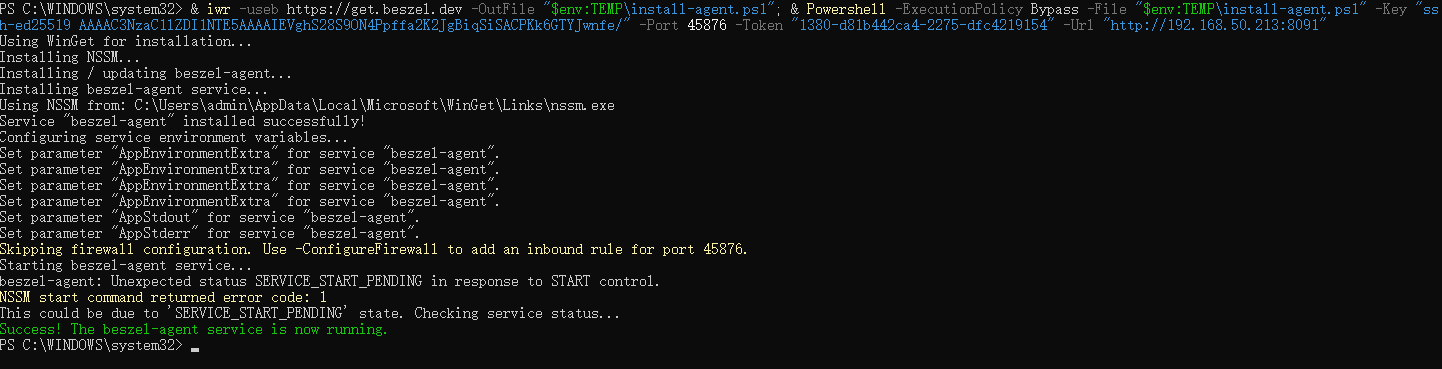 & iwr -useb https://get.beszel.dev -OutFile "$env:TEMP\install-agent.ps1"; & Powershell -ExecutionPolicy Bypass -File "$env:TEMP\install-agent.ps1" -Key "ssh-ed25519 AAAAC3NzaC1lZDI1NTE5AAAAIEVghS28S9ON4Ppffa2K2JgBiqSiSACPKk6GTYJwnfe/" -Port 45876 -Token "1380-d81b442ca4-2275-dfc4219154" -Url "http://192.168.50.213:8091"